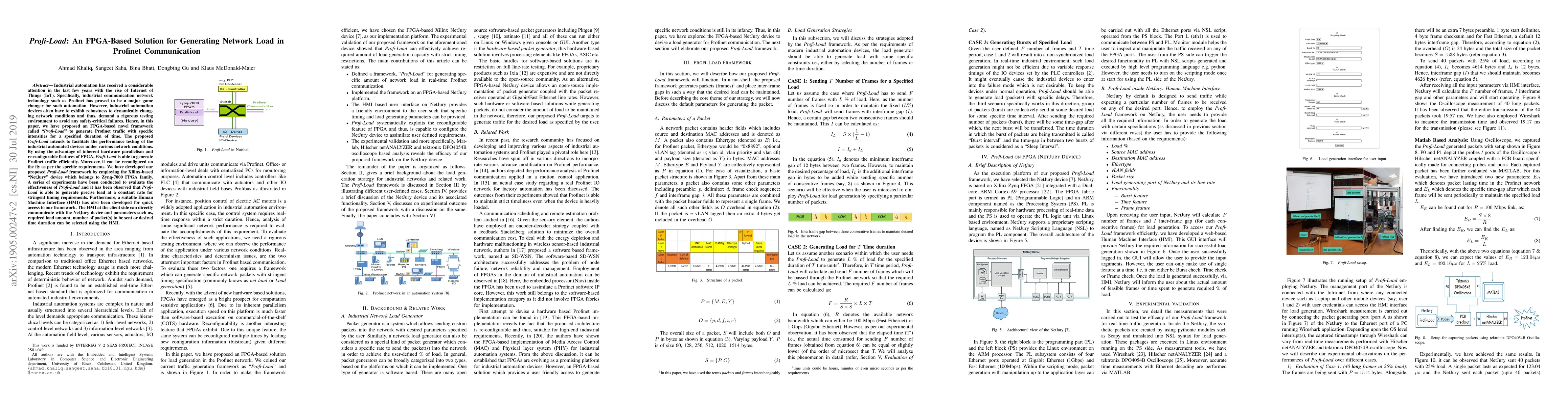 Industrial automation has received a considerable attention in the last few years with the rise of Internet of Things (IoT). Specifically, industrial communication network technology such as Profinet has proved to be a major game changer for such automation. However, industrial automation devices often have to exhibit robustness to dynamically changing network conditions and thus, demand a rigorous testing environment to avoid any safety-critical failures. Hence, in this paper, we have proposed an FPGA-based novel framework called Profi-Load to generate Profinet traffic with specific intensities for a specified duration of time. The proposed Profi-Load intends to facilitate the performance testing of the industrial automated devices under various network conditions. By using the advantage of inherent hardware parallelism and re-configurable features of FPGA, Profi-Load is able to generate Profinet traffic efficiently. Moreover, it can be reconfigured on the fly as per the specific requirements. We have developed our proposed Profi-Load framework by employing the Xilinx-based NetJury device which belongs to Zynq-7000 FPGA family. A series of experiments have been conducted to evaluate the effectiveness of Profi-Load and it has been observed that Profi-Load is able to generate precise load at a constant rate for stringent timing requirements. Furthermore, a suitable Human Machine Interface (HMI) has also been developed for quick access to our framework. The HMI at the client side can directly communicate with the NetJury device and parameters such as, required load amount, number of packet(s) to be sent or desired time duration can be selected using the HMI.