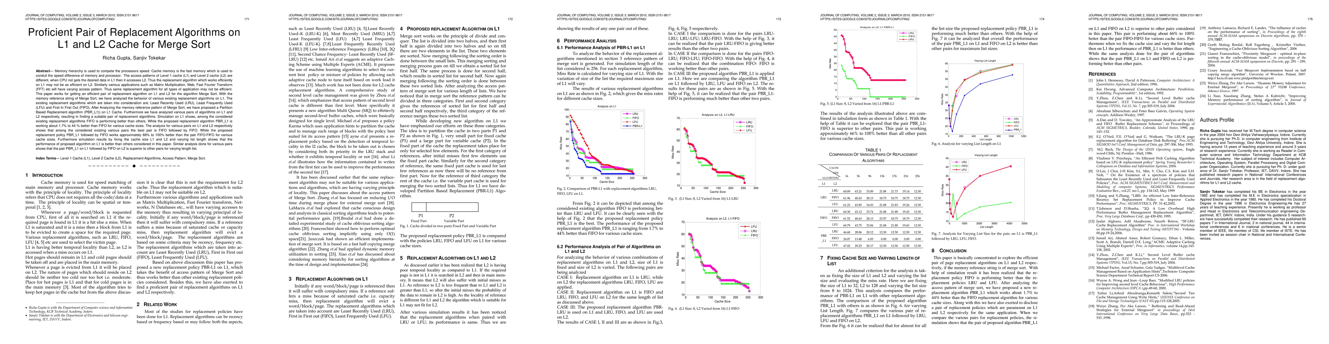 This paper investigates efficient replacement algorithms for L1 and L2 caches tailored for Merge Sort. It evaluates existing algorithms like LRU, LFU, and FIFO, proposing a new Partition Based Replacement (PBR_L1) for L1 cache, which outperforms FIFO by 1.7% to 44% depending on cache size. The study also identifies optimal pairs of algorithms for L1 and L2 caches to enhance performance.