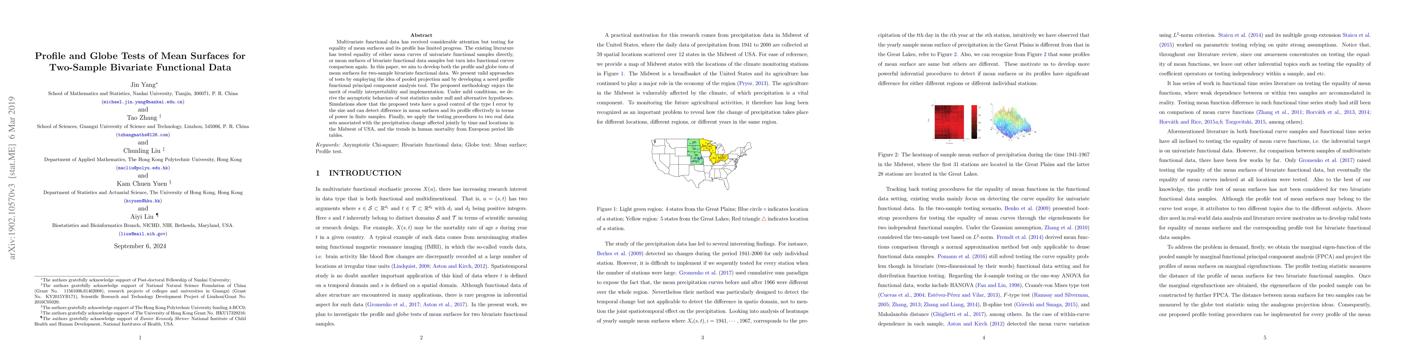 This paper develops profile and globe tests for comparing mean surfaces in two-sample bivariate functional data, employing pooled projection and a novel profile functional principal component analysis tool. The proposed tests show good control of type I error and effective power in simulations, and are applied to real datasets on precipitation change and mortality trends.