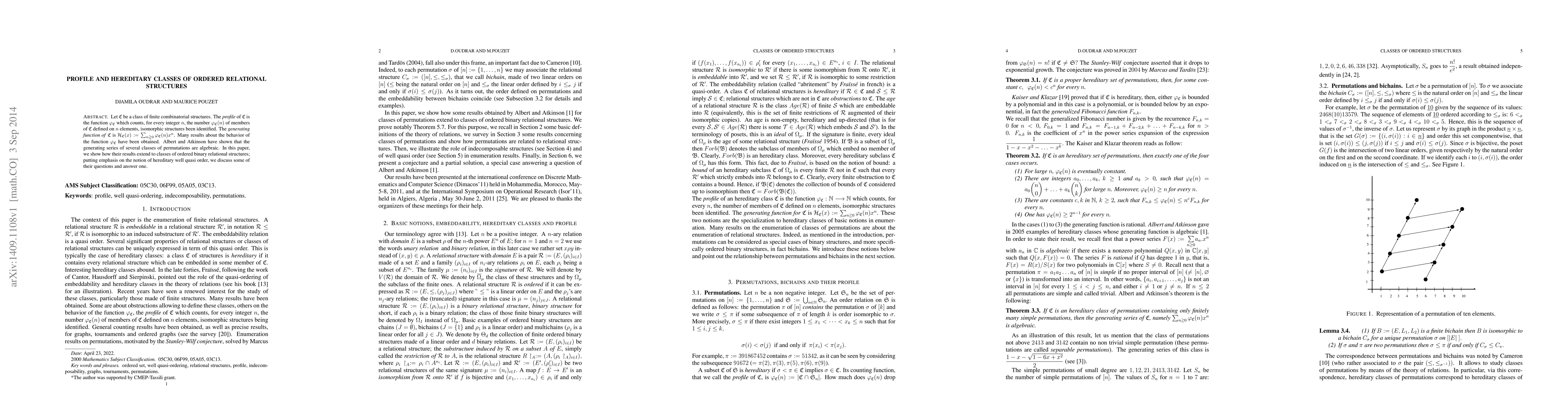 Let $\mathfrak{C}$ be a class of finite combinatorial structures. The \textit{profile} of $\mathfrak{C}$ is the function $\varphi_{\mathfrak{C}}$ which counts, for every integer $n$, the number $\varphi_{\mathfrak{C}}(n)$ of members of $\mathfrak{C}$ defined on $n$ elements, isomorphic structures been identified. The \textit{generating function of} $\mathfrak{C}$ is $\mathcal {H}_{\mathfrak{C}}(x):=\sum_{n\geqq 0}\varphi_{\mathfrak{C}}(n)x^{n}$. Many results about the behavior of the function $\varphi_{\mathfrak{C}}$ have been obtained. Albert and Atkinson have shown that the generating series of several classes of permutations are algebraic. In this paper, we show how their results extend to classes of ordered binary relational structures; putting emphasis on the notion of hereditary well quasi order, we discuss some of their questions and answer one.