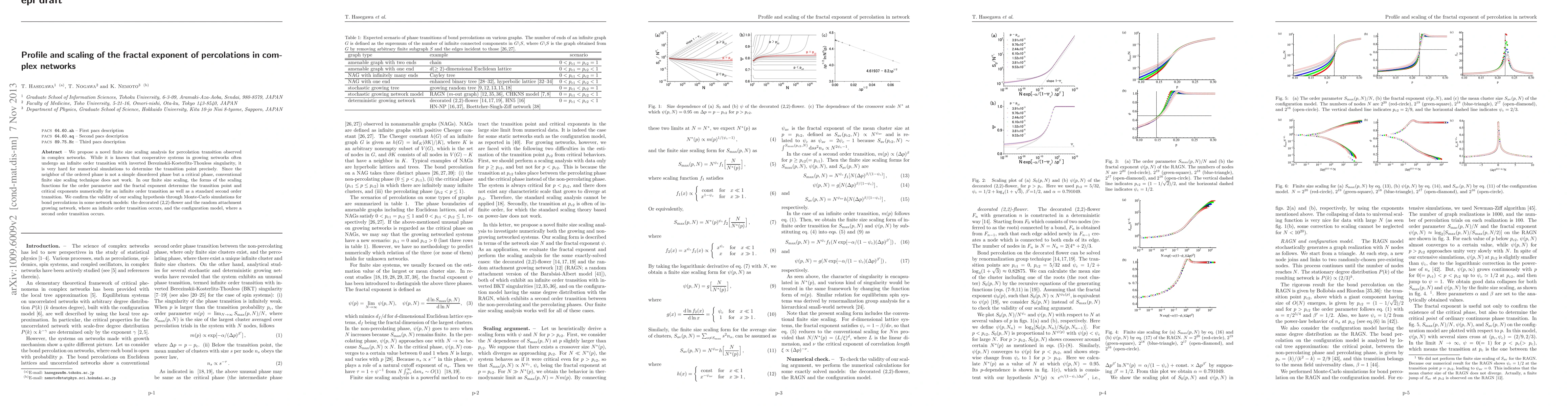 We propose a novel finite size scaling analysis for percolation transition observed in complex networks. While it is known that cooperative systems in growing networks often undergo an infinite order transition with inverted Berezinskii-Kosterlitz-Thouless singularity, it is very hard for numerical simulations to determine the transition point precisely. Since the neighbor of the ordered phase is not a simple disordered phase but a critical phase, conventional finite size scaling technique does not work. In our finite size scaling, the forms of the scaling functions for the order parameter and the fractal exponent determine the transition point and critical exponents numerically for an infinite order transition as well as a standard second order transition. We confirm the validity of our scaling hypothesis through Monte-Carlo simulations for bond percolations in some network models: the decorated (2,2)-flower and the random attachment growing network, where an infinite order transition occurs, and the configuration model, where a second order transition occurs.