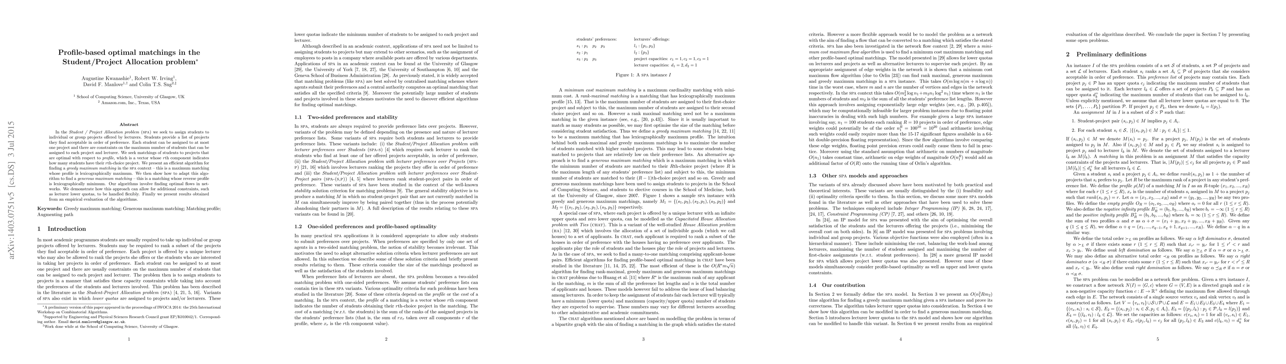 This paper presents efficient algorithms for solving the Student/Project Allocation problem by finding optimal matchings that maximize the profile, which measures student preference satisfaction. The algorithms can also accommodate additional constraints like lecturer quotas and were evaluated empirically.