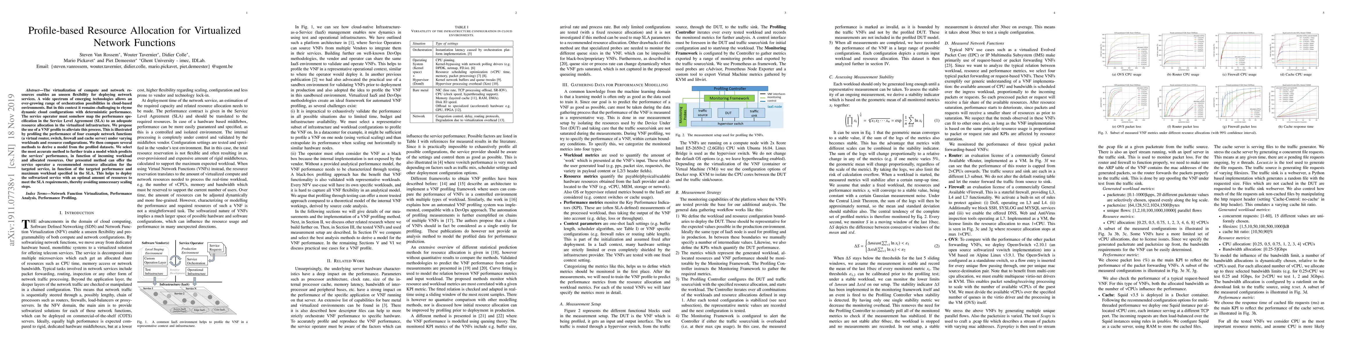 The virtualization of compute and network resources enables an unseen flexibility for deploying network services. A wide spectrum of emerging technologies allows an ever-growing range of orchestration possibilities in cloud-based environments. But in this context it remains challenging to rhyme dynamic cloud configurations with deterministic performance. The service operator must somehow map the performance specification in the Service Level Agreement (SLA) to an adequate resource allocation in the virtualized infrastructure. We propose the use of a VNF profile to alleviate this process. This is illustrated by profiling the performance of four example network functions (a virtual router, switch, firewall and cache server) under varying workloads and resource configurations. We then compare several methods to derive a model from the profiled datasets. We select the most accurate method to further train a model which predicts the services' performance, in function of incoming workload and allocated resources. Our presented method can offer the service operator a recommended resource allocation for the targeted service, in function of the targeted performance and maximum workload specified in the SLA. This helps to deploy the softwarized service with an optimal amount of resources to meet the SLA requirements, thereby avoiding unnecessary scaling steps.