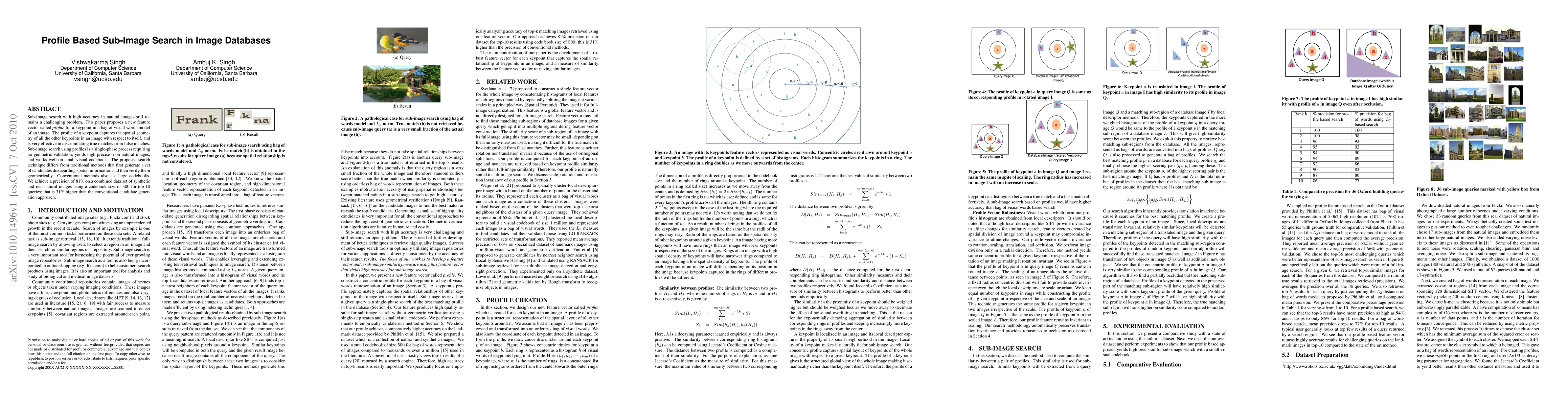 Sub-image search with high accuracy in natural images still remains a challenging problem. This paper proposes a new feature vector called profile for a keypoint in a bag of visual words model of an image. The profile of a keypoint captures the spatial geometry of all the other keypoints in an image with respect to itself, and is very effective in discriminating true matches from false matches. Sub-image search using profiles is a single-phase process requiring no geometric validation, yields high precision on natural images, and works well on small visual codebook. The proposed search technique differs from traditional methods that first generate a set of candidates disregarding spatial information and then verify them geometrically. Conventional methods also use large codebooks. We achieve a precision of 81% on a combined data set of synthetic and real natural images using a codebook size of 500 for top-10 queries; that is 31% higher than the conventional candidate generation approach.