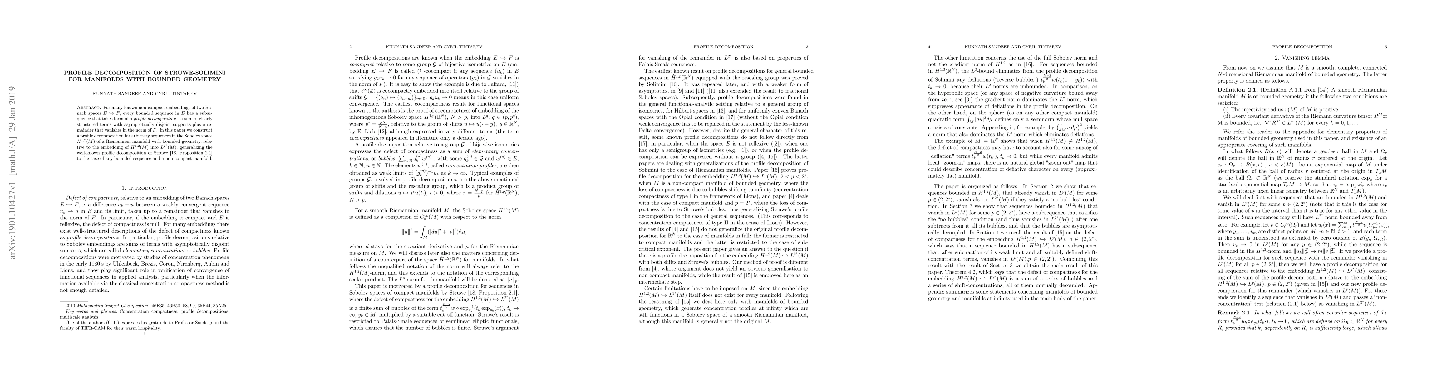 This paper constructs a profile decomposition for sequences in the Sobolev space $H^{1,2}(M)$ on a Riemannian manifold with bounded geometry, generalizing Struwe's decomposition to non-compact embeddings and any bounded sequence. The decomposition separates terms with disjoint supports and a vanishing remainder.