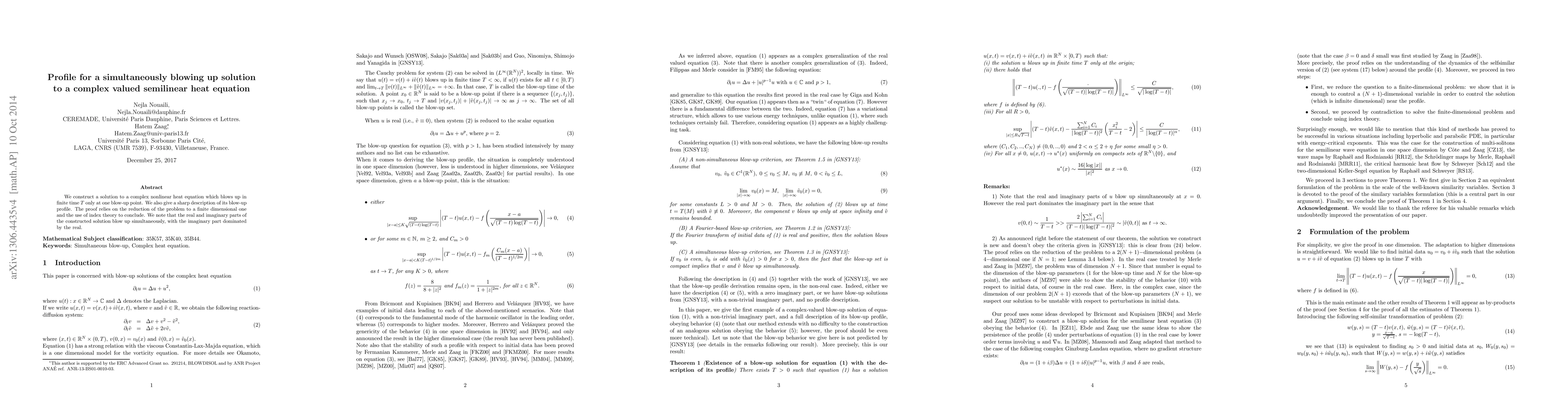 We construct a solution to a complex nonlinear heat equation which blows up in finite time $T$ only at one blow-up point. We also give a sharp description of its blow-up profile. The proof relies on the reduction of the problem to a finite dimensional one and the use of index theory to conclude. We note that the real and imaginary parts of the constructed solution blow up simultaneously.