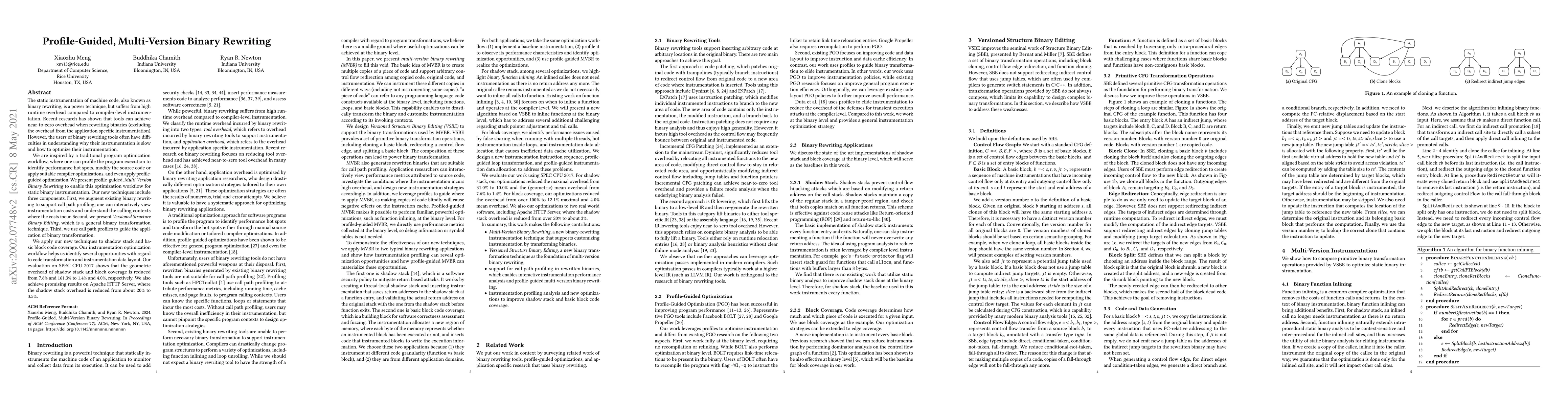 This paper introduces profile-guided, multi-version binary rewriting to optimize static binary instrumentation, reducing overhead from 7.6% to 1.4% for shadow stack and from 161.3% to 4.0% for basic block coverage on SPEC CPU 2017. The approach includes call path profiling, versioned structure binary editing, and profile-guided binary transformation.