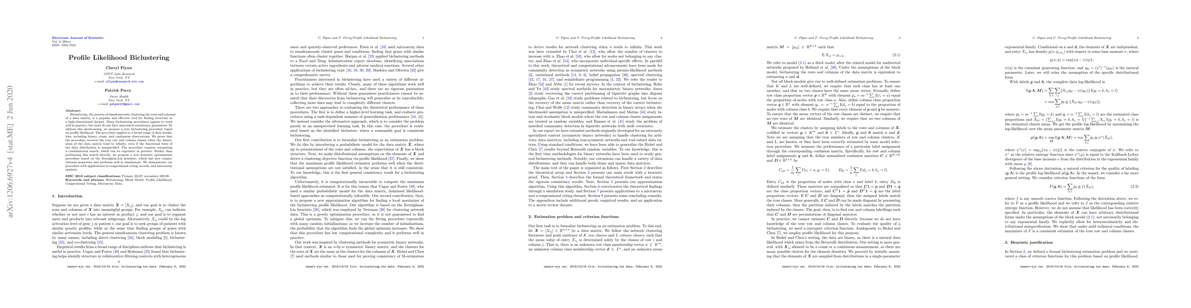 This paper introduces a new biclustering procedure based on profile likelihood, providing consistency guarantees for recovering true row and column classes in high-dimensional datasets. It employs a heuristic optimization method based on the Kernighan-Lin heuristic to manage computational costs, demonstrating its effectiveness through applications in congressional voting records and microarray analysis.
