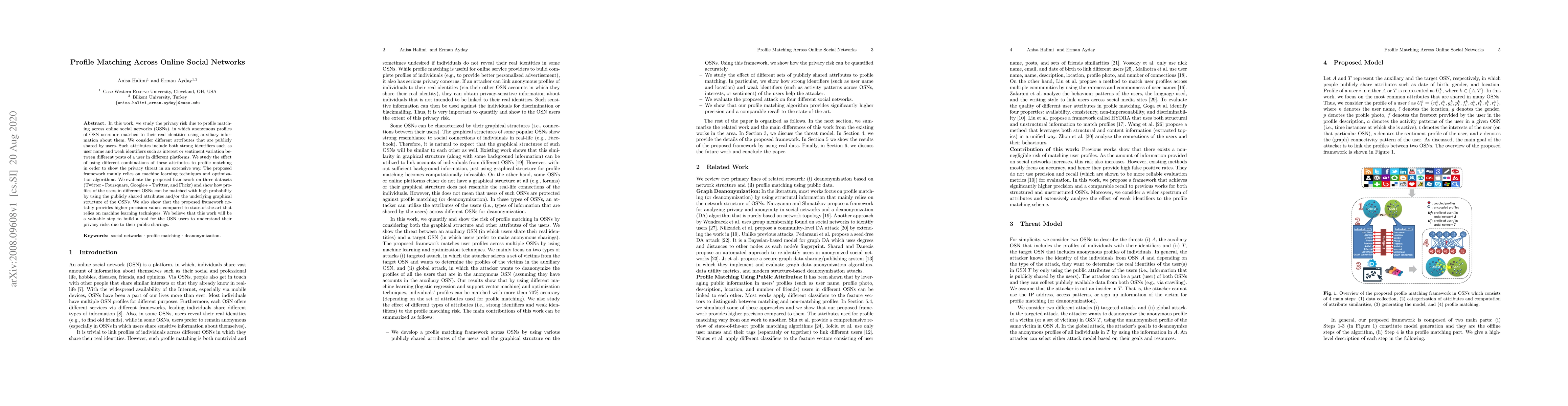 In this work, we study the privacy risk due to profile matching across online social networks (OSNs), in which anonymous profiles of OSN users are matched to their real identities using auxiliary information about them. We consider different attributes that are publicly shared by users. Such attributes include both strong identifiers such as user name and weak identifiers such as interest or sentiment variation between different posts of a user in different platforms. We study the effect of using different combinations of these attributes to profile matching in order to show the privacy threat in an extensive way. The proposed framework mainly relies on machine learning techniques and optimization algorithms. We evaluate the proposed framework on three datasets (Twitter - Foursquare, Google+ - Twitter, and Flickr) and show how profiles of the users in different OSNs can be matched with high probability by using the publicly shared attributes and/or the underlying graphical structure of the OSNs. We also show that the proposed framework notably provides higher precision values compared to state-of-the-art that relies on machine learning techniques. We believe that this work will be a valuable step to build a tool for the OSN users to understand their privacy risks due to their public sharings.