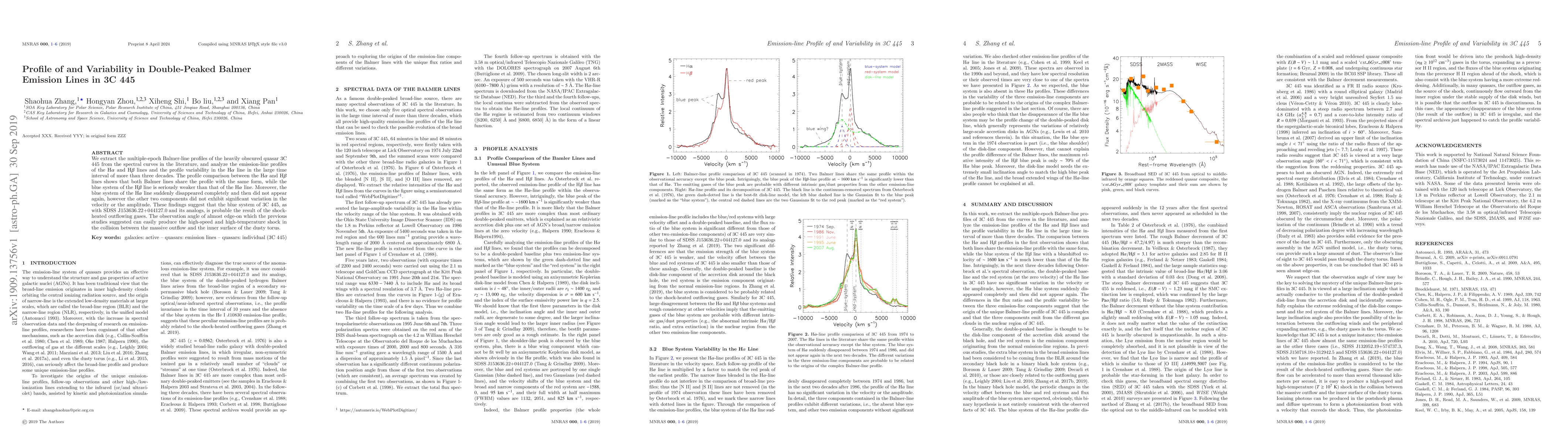 The research analyzes the Balmer-line profiles of quasar 3C 445, finding that Hα and Hβ lines share a similar form, but Hβ's blue system is weaker. The blue system of Hα vanished and didn't return, while other components remained stable, suggesting it's likely due to shock-heated outflowing gases. This supports previous suggestions of an almost edge-on observation angle causing high-speed, high-temperature shock collisions with the inner torus surface.