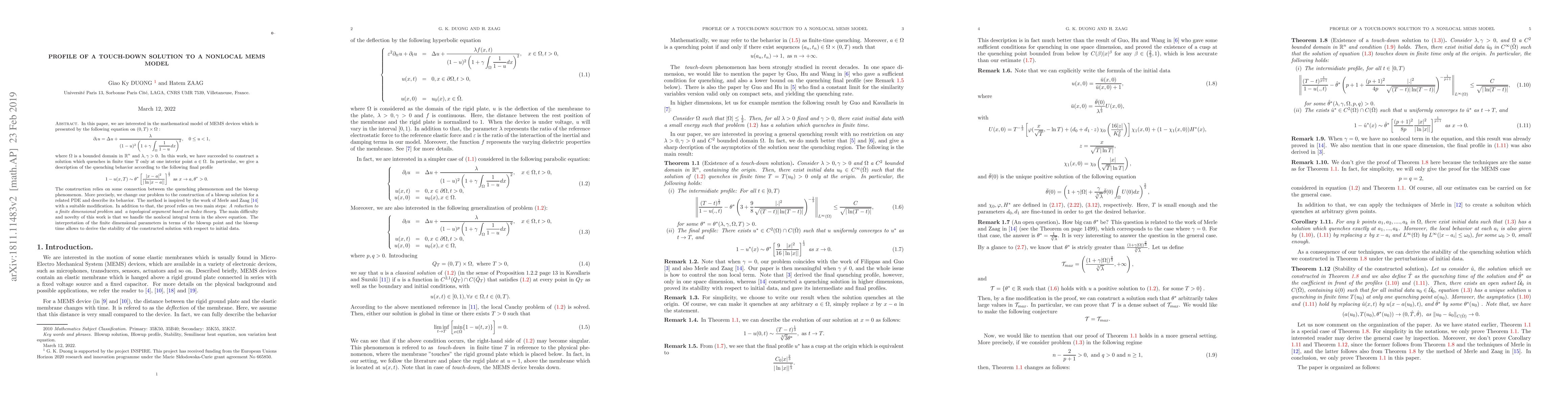 In this paper, we are interested in the mathematical model of MEMS devices which is presented by the following equation on $(0,T) \times \Omega:$ \begin{eqnarray*} \partial_t u = \Delta u +\displaystyle \frac{\lambda }{ (1-u)^2 \left( 1 +\displaystyle \gamma \int_{\Omega} \frac{1}{1-u} dx \right)^2}, \quad 0 \leq u <1, \end{eqnarray*} where $\Omega$ is a bounded domain in $\mathbb{R}^n$ and $\lambda, \gamma > 0$. In this work, we have succeeded to construct a solution which quenches in finite time T only at one interior point $a \in \Omega$. In particular, we give a description of the quenching behavior according to the following final profile $$ 1 - u(x,T) \sim \theta^*\left[ \frac{|x-a|^2}{|\ln|x-a||} \right]^\frac{1}{3} \text{ as } x \to a, \theta^* > 0.$$ The construction relies on some connection between the quenching phemonenon and the blowup phenomenon. More precisely, we change our problem to the construction of a blowup solution for a related PDE and describe its behavior. The proof relies on two main steps: A reduction to a finite dimensional problem and a topological argument based on Index theory. The highlight of this work is that we handle the nonlocal integral term in the above equation. The interpretation of the finite dimensional parameters in terms of the blowup point and the blowup time allows to derive the stability of the constructed solution with respect to initial data.