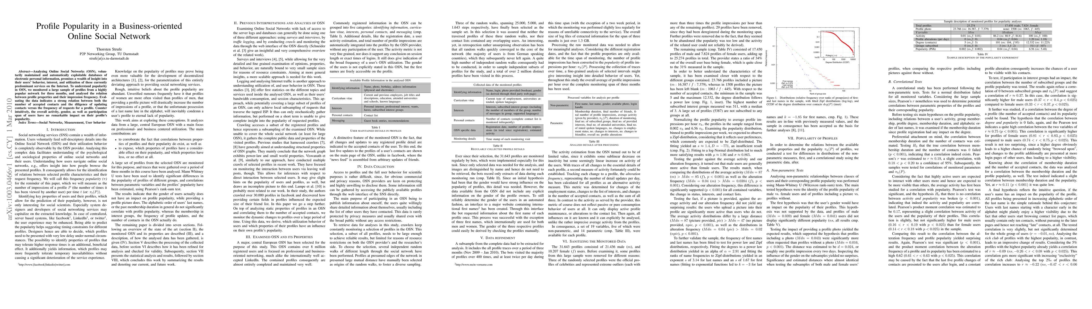 This study investigates the factors influencing profile popularity in a business-oriented online social network by analyzing profile properties and impression frequency over three months. The results show a strong correlation between the number of contacts and profile update frequency with popularity, while overall activity, gender, and participation duration have negligible effects.