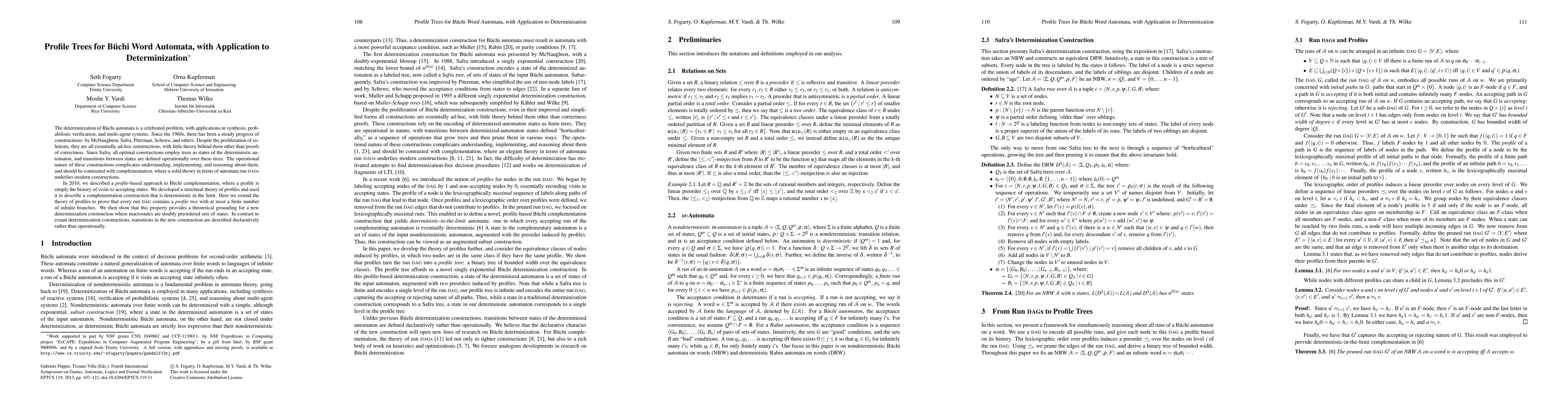 This paper introduces a new theoretical framework for determinizing Büchi automata based on "profile trees," extending previous profile-based complementation methods. Unlike ad-hoc operational constructions, this method uses declarative transitions to define macrostates as doubly preordered sets, providing a more understandable and implementable determinization approach.
