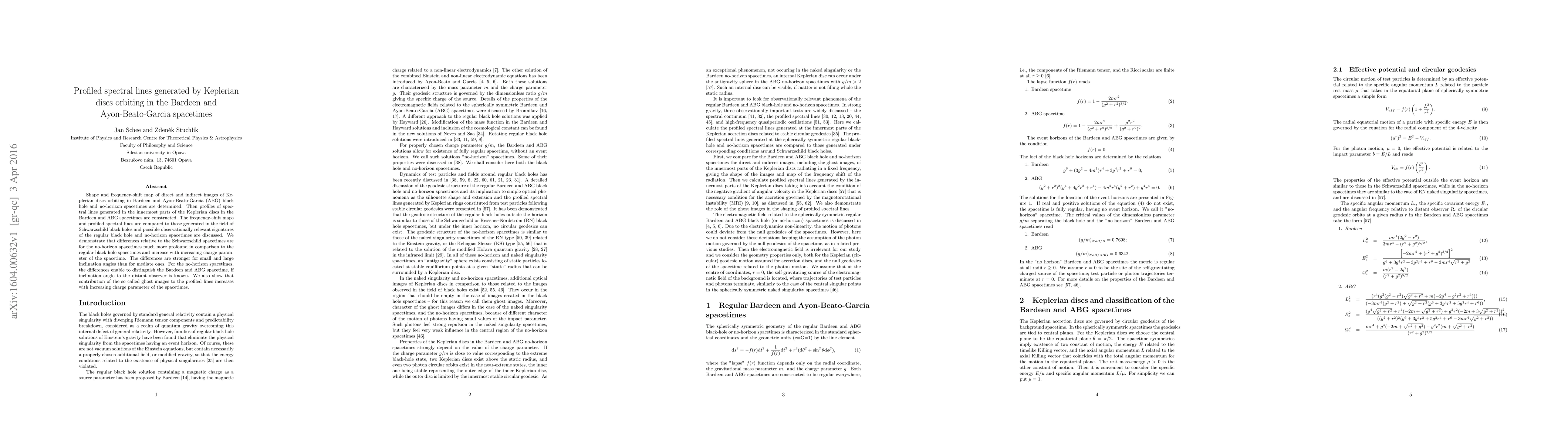 Shape and frequency-shift map of direct and indirect images of Keplerian discs orbiting in Bardeen and Ayon-Beato-Garcia (ABG) black hole and no-horizon spacetimes are determined. Then profiles of spectral lines generated in the innermost parts of the Keplerian discs in the Bardeen and ABG spacetimes are constructed. The frequency-shift maps and profiled spectral lines are compared to those generated in the field of Schwarzschild black holes and possible observationally relevant signatures of the regular black hole and no-horizon spacetimes are discussed. We demonstrate that differences relative to the Schwarzschild spacetimes are for the no-horizon spacetimes much more profound in comparison to the regular black hole spacetimes and increase with increasing charge parameter of the spacetime. The differences are stronger for small and large inclination angles than for mediate ones. For the no-horizon spacetimes, the differences enable to distinguish the Bardeen and ABG spacetime, if inclination angle to the distant observer is known. We also show that contribution of the so called ghost images to the profiled lines increases with increasing charge parameter of the spacetimes.