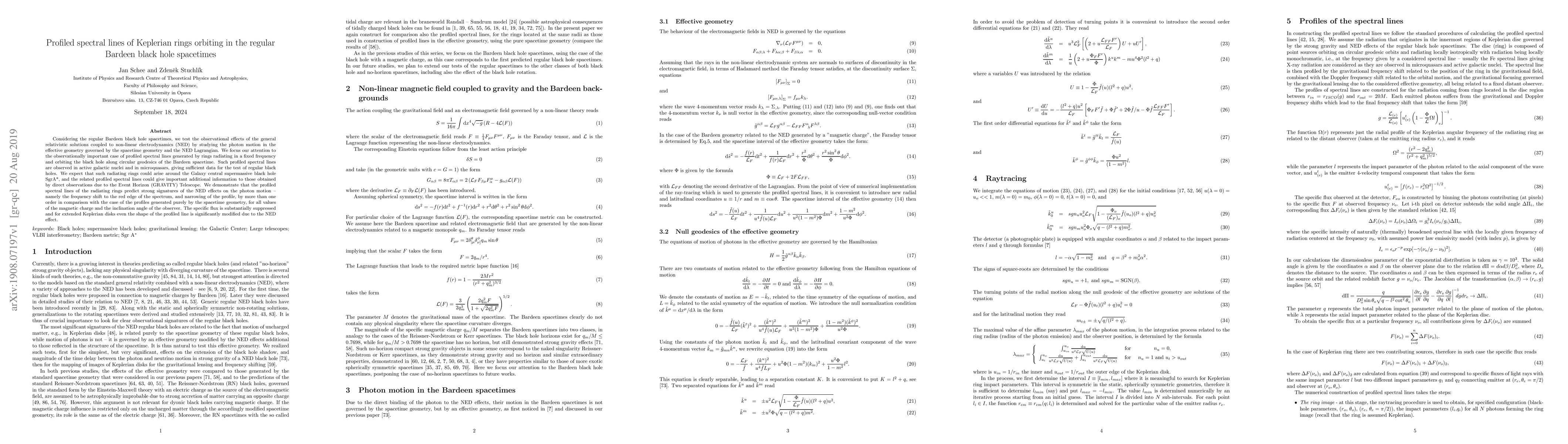 The research investigates profiled spectral lines from Keplerian rings orbiting regular Bardeen black holes, coupled with non-linear electrodynamics (NED). It finds that NED causes significant redshift, profile narrowing, and flux suppression in these spectral lines, providing testable signatures for observing and distinguishing regular black holes from classical ones, potentially applicable to SgrA* and observable with GRAVITY Telescope.