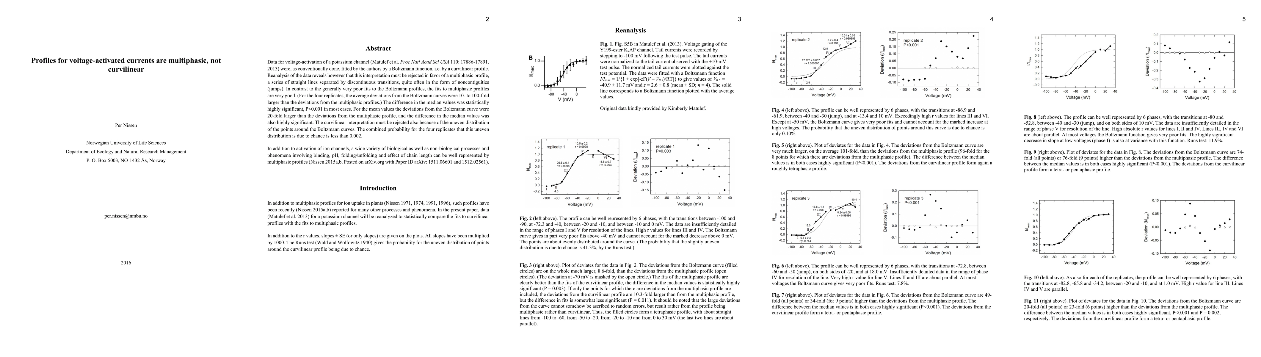 A reanalysis of data on voltage-activated potassium channels reveals that their profiles are not curvilinear but rather multiphasic, consisting of multiple straight lines with discontinuous transitions, leading to better fits than traditional Boltzmann functions.