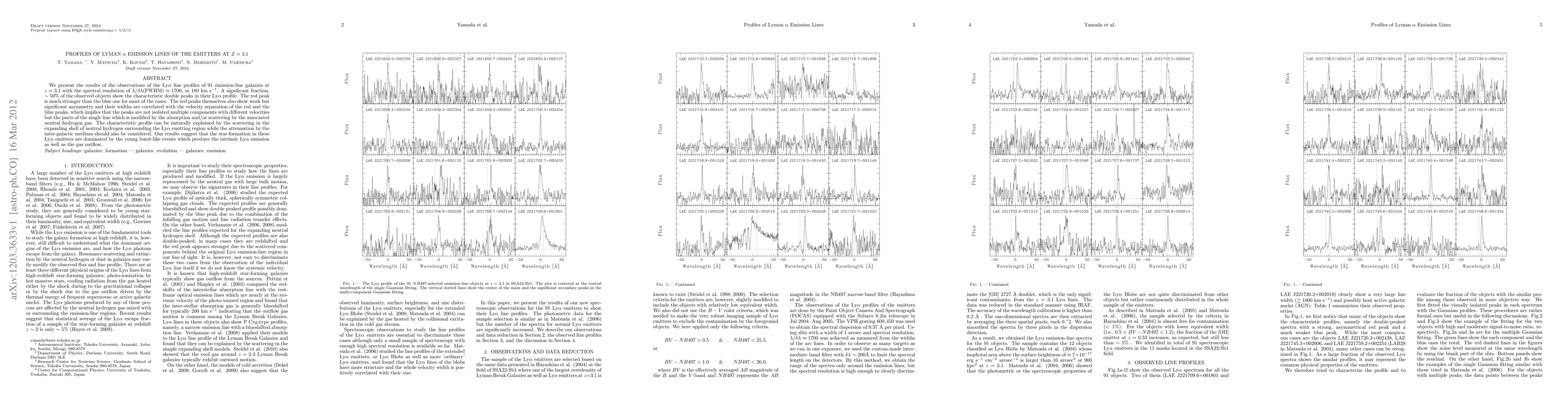 We present the results of the observations of the Ly\alpha\ line profiles of 91 emission-line galaxies at z=3.1 with the spectral resolution of \lambda/\delta\lambda (FWHM) = 1700, or 180 km/s. A significant fraction, ~50% of the observed objects show the characteristic double peaks in their Ly\alpha profile. The red peak is much stronger than the blue one for most of the cases. The red peaks themselves also show weak but significant asymmetry and their widths are correlated with the velocity separation of the red and the blue peaks, which implies that the peaks are not isolated multiple components with different velocities but the parts of the single line which is modified by the absorption and/or scattering by the associated neutral hydrogen gas. The characteristic profile can be naturally explained by the scattering in the expanding shell of neutral hydrogen surrounding the Ly\alpha\ emitting region while the attenuation by the inter-galactic medium should also be considered. Our results suggest that the star-formation in these Ly\alpha\ emitters are dominated by the young burst-like events which produce the intrinsic Ly\alpha\ emission as well as the gas outflow.