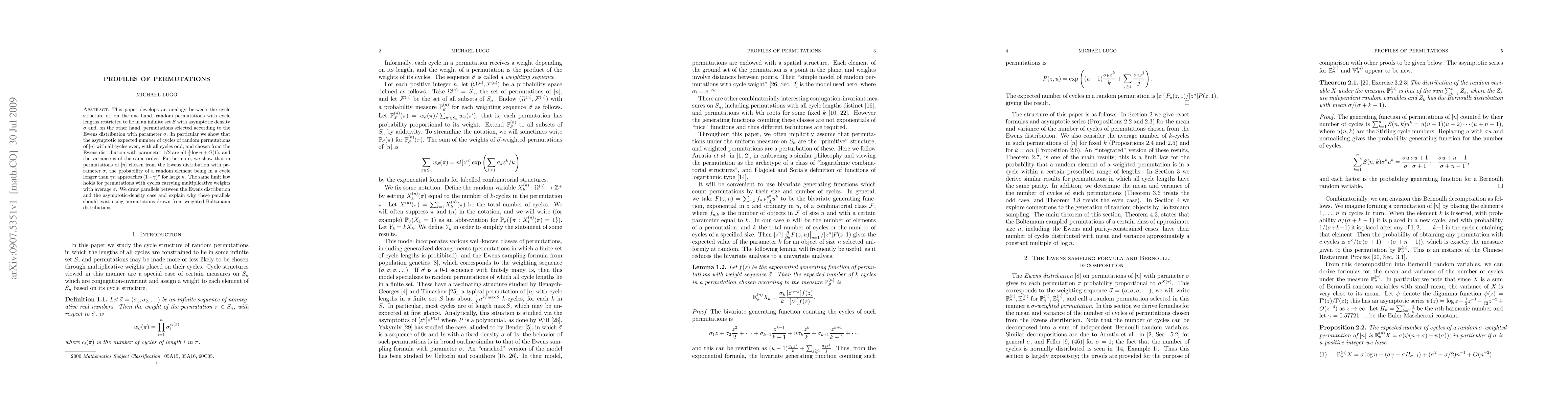 This paper explores the cycle structure of permutations under different distributions, showing that random permutations with restricted cycle lengths and those from the Ewens distribution with parameter 1/2 both have an asymptotic expected number of cycles of ${1 \over 2} \log n + O(1)$. It also establishes that the probability of a random element being in a cycle longer than $\gamma n$ approaches $(1-\gamma)^\sigma$ for large $n$.