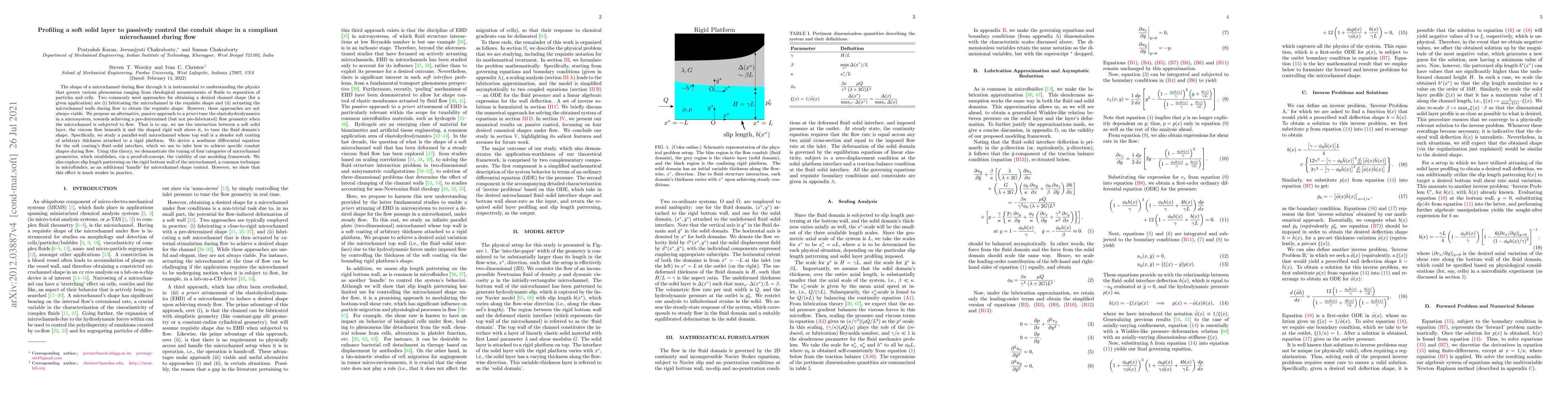 This paper proposes a passive method to control the shape of a microchannel during fluid flow by utilizing a soft solid layer beneath the flow. The authors derive a nonlinear differential equation to model the fluid-solid interface and demonstrate the ability to achieve specific conduit shapes, establishing the viability of their approach through a proof-of-concept. They also explore the weaker influence of slip length patterning on shape control.