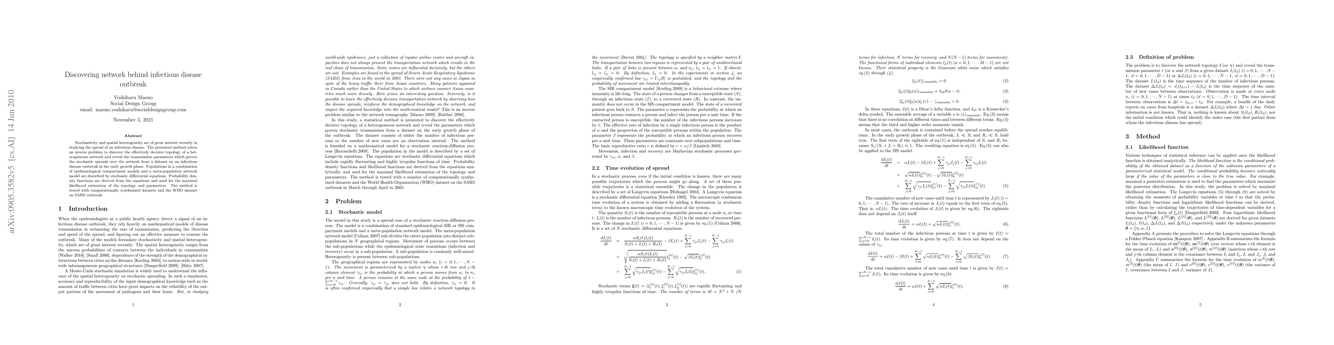 This paper proposes a method to determine the underlying network topology and transmission parameters of an infectious disease outbreak by solving an inverse problem using stochastic differential equations and maximal likelihood estimation, tested on both synthetic and real SARS outbreak data.