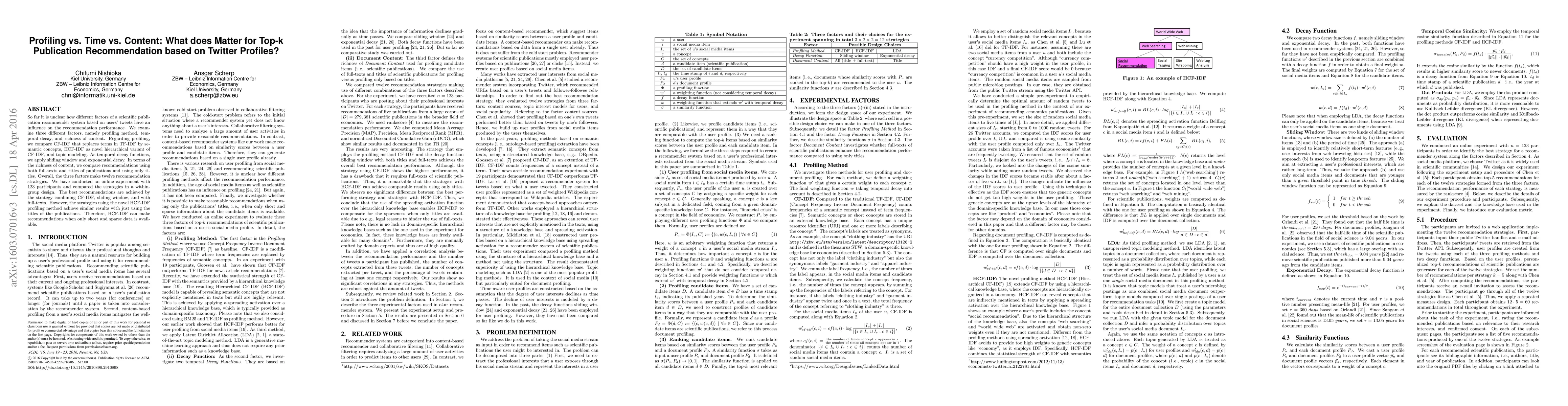 So far it is unclear how different factors of a scientific publication recommender system based on users' tweets have an influence on the recommendation performance. We examine three different factors, namely profiling method, temporal decay, and richness of content. Regarding profiling, we compare CF-IDF that replaces terms in TF-IDF by semantic concepts, HCF-IDF as novel hierarchical variant of CF-IDF, and topic modeling. As temporal decay functions, we apply sliding window and exponential decay. In terms of the richness of content, we compare recommendations using both full-texts and titles of publications and using only titles. Overall, the three factors make twelve recommendation strategies. We have conducted an online experiment with 123 participants and compared the strategies in a within-group design. The best recommendations are achieved by the strategy combining CF-IDF, sliding window, and with full-texts. However, the strategies using the novel HCF-IDF profiling method achieve similar results with just using the titles of the publications. Therefore, HCF-IDF can make recommendations when only short and sparse data is available.