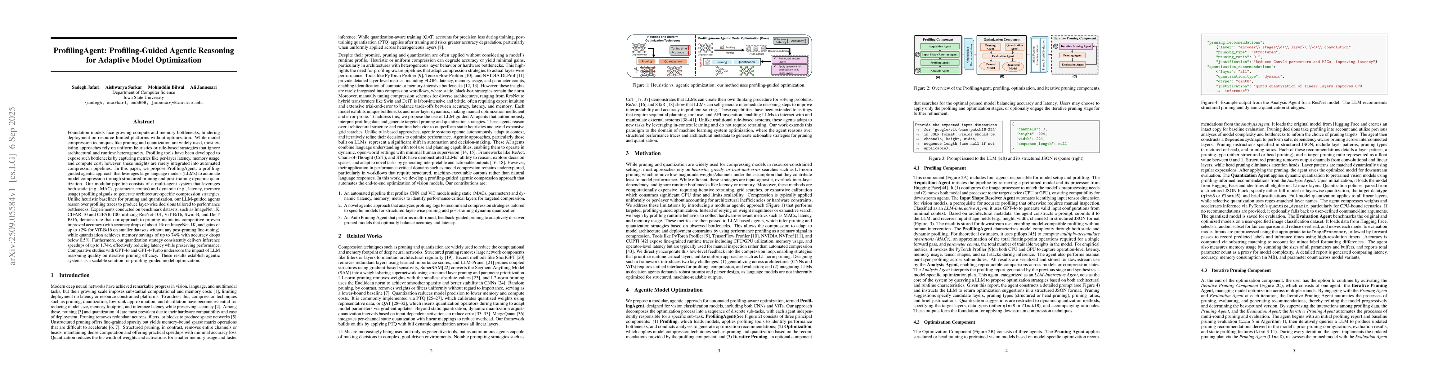 Foundation models face growing compute and memory bottlenecks, hindering deployment on resource-limited platforms. While compression techniques such as pruning and quantization are widely used, most rely on uniform heuristics that ignore architectural and runtime heterogeneity. Profiling tools expose per-layer latency, memory, and compute cost, yet are rarely integrated into automated pipelines. We propose ProfilingAgent, a profiling-guided, agentic approach that uses large language models (LLMs) to automate compression via structured pruning and post-training dynamic quantization. Our modular multi-agent system reasons over static metrics (MACs, parameter counts) and dynamic signals (latency, memory) to design architecture-specific strategies. Unlike heuristic baselines, ProfilingAgent tailors layer-wise decisions to bottlenecks. Experiments on ImageNet-1K, CIFAR-10, and CIFAR-100 with ResNet-101, ViT-B/16, Swin-B, and DeiT-B/16 show pruning maintains competitive or improved accuracy (about 1% drop on ImageNet-1K, +2% gains for ViT-B/16 on smaller datasets), while quantization achieves up to 74% memory savings with <0.5% accuracy loss. Our quantization also yields consistent inference speedups of up to 1.74 times faster. Comparative studies with GPT-4o and GPT-4-Turbo highlight the importance of LLM reasoning quality for iterative pruning. These results establish agentic systems as scalable solutions for profiling-guided model optimization.