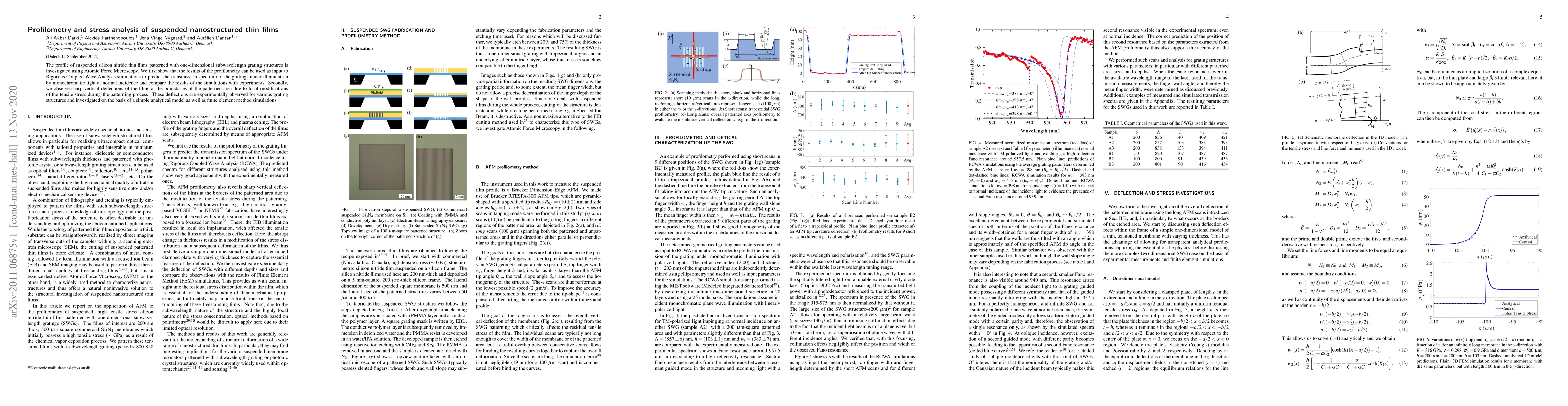 This study uses atomic force microscopy to analyze the surface profiles of suspended silicon nitride nanostructures and combines these measurements with simulations to predict their light transmission properties. It also finds that patterning causes sharp vertical deflections in the films due to changes in internal stress, which are modeled and experimentally confirmed.