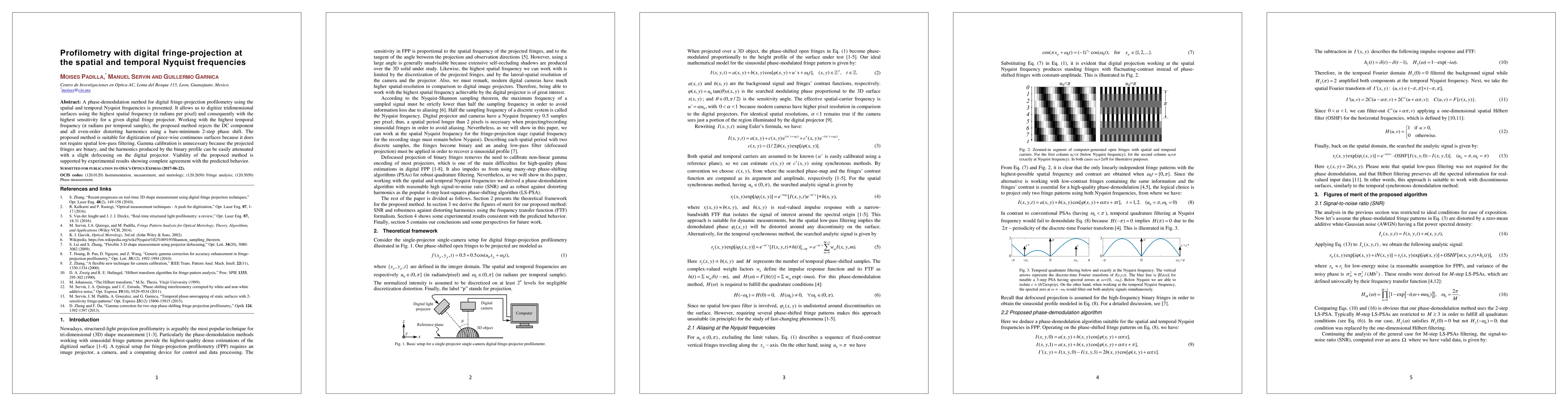 This paper presents a phase-demodulation method for digital fringe-projection profilometry that operates at the spatial and temporal Nyquist frequencies, achieving high sensitivity and minimal distortion by rejecting even-order harmonics with a 2-step phase shift. Experimental results confirm the method's effectiveness for digitizing piece-wise continuous surfaces without requiring spatial low-pass filtering or gamma calibration.