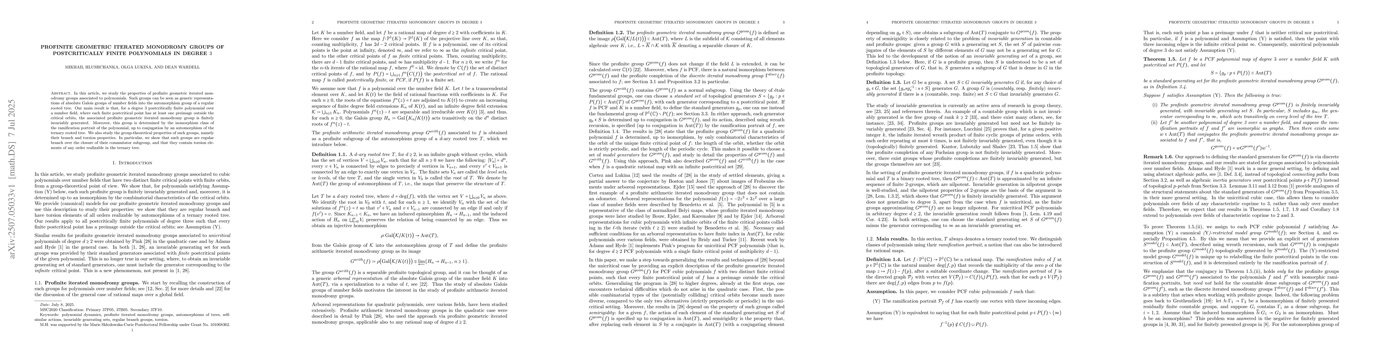 In this article, we study the properties of profinite geometric iterated monodromy groups associated to polynomials. Such groups can be seen as generic representations of absolute Galois groups of number fields into the automorphism group of a regular rooted tree. Our main result is that, for a degree 3 postcritically finite polynomial over a number field, where each finite postcritical point has at least one preimage outside the critical orbits, the associated profinite geometric iterated monodromy group is finitely invariably generated. Moreover, this group is determined by the isomorphism class of the ramification portrait of the polynomial, up to conjugation by an automorphism of the ternary rooted tree. We also study the group-theoretical properties of such groups, namely their branch and torsion properties. In particular, we show that such groups are regular branch over the closure of their commutator subgroup, and that they contain torsion elements of any order realizable in the ternary tree.