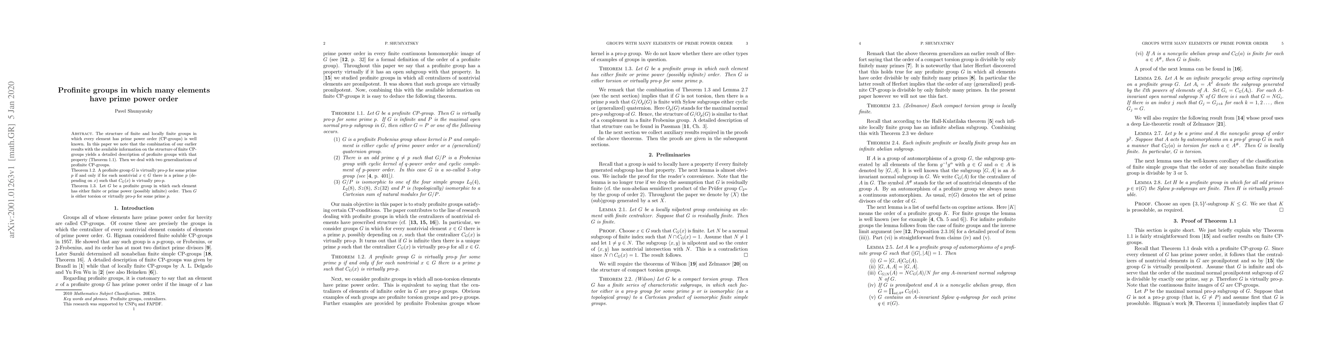 The structure of finite and locally finite groups in which every element has prime power order (CP-groups) is well known. In this paper we note that the combination of our earlier results with the available information on the structure of finite CP-groups yields a detailed description of profinite groups with that property. Then we deal with two generalizations of profinite CP-groups. Theorem 1.2. A profinite group G is virtually pro-p for some prime p if and only if for each nontrivial x in G there is a prime p (depending on x) such that the centralizer of x is virtually pro-p. Theorem 1.3. Let G be a profinite group in which each element has either finite or prime power (possibly infinite) order. Then G is either torsion or virtually pro-p for some prime p.
