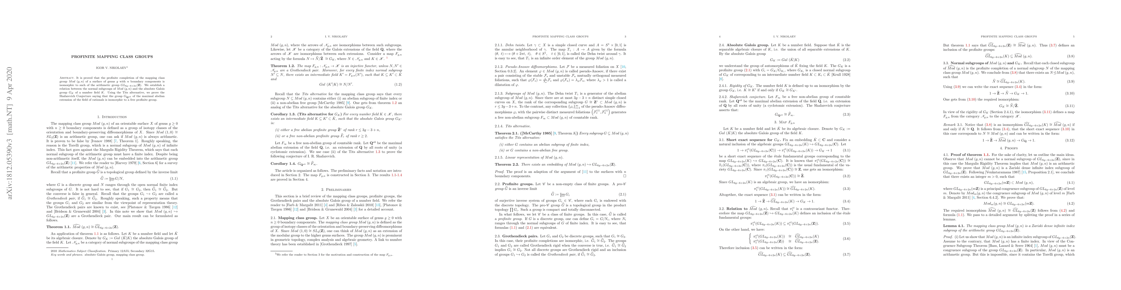 The paper establishes a connection between the profinite completion of the mapping class group Mod(g,n) and the arithmetic group GL(6g-6+2n, Z), using the Tits alternative to prove the Shafarevich Conjecture about the absolute Galois group.