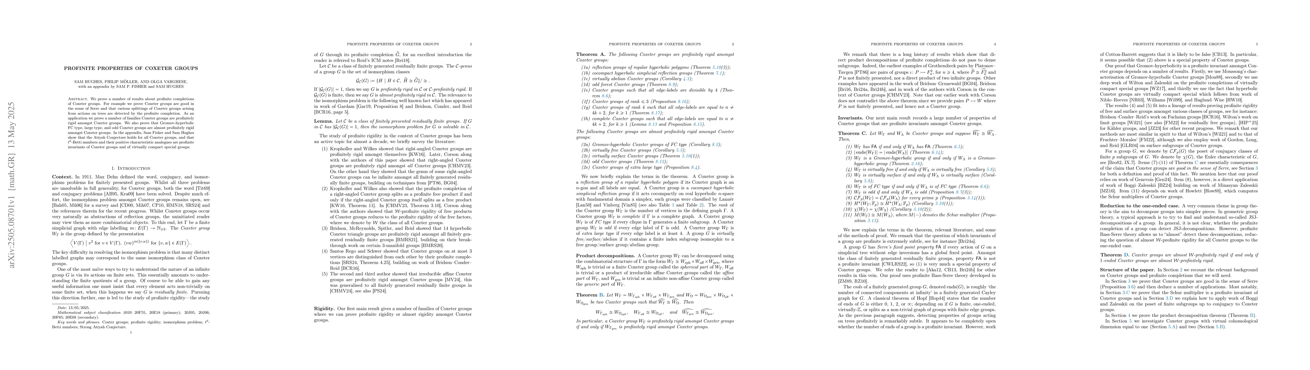 The paper proves various results about profinite completions of Coxeter groups using methods from geometric group theory, including demonstrating Coxeter groups are good in Serre's sense and analyzing splittings arising from actions on trees.