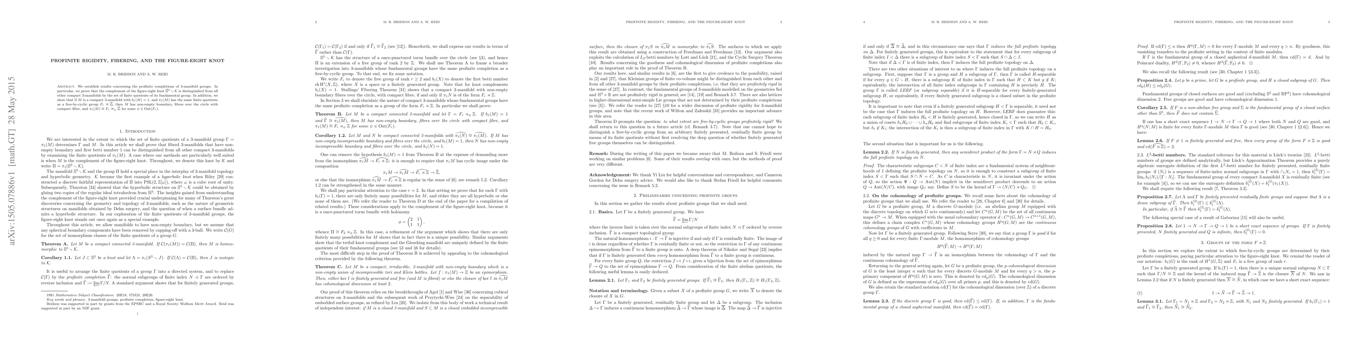 We establish results concerning the profinite completions of 3-manifold groups. In particular, we prove that the complement of the figure-eight knot $S^3-K$ is distinguished from all other compact 3-manifolds by the set of finite quotients of its fundamental group. In addition, we show that if $M$ is a compact 3-manifold with $b_1(M)=1$, and $\pi_1(M)$ has the same finite quotients as a free-by-cyclic group $F_r\rtimes\mathbb{Z}$, then $M$ has non-empty boundary, fibres over the circle with compact fibre, and $\pi_1(M)\cong F_r\rtimes_\psi\mathbb{Z}$ for some $\psi\in{\rm{Out}}(F_r)$.