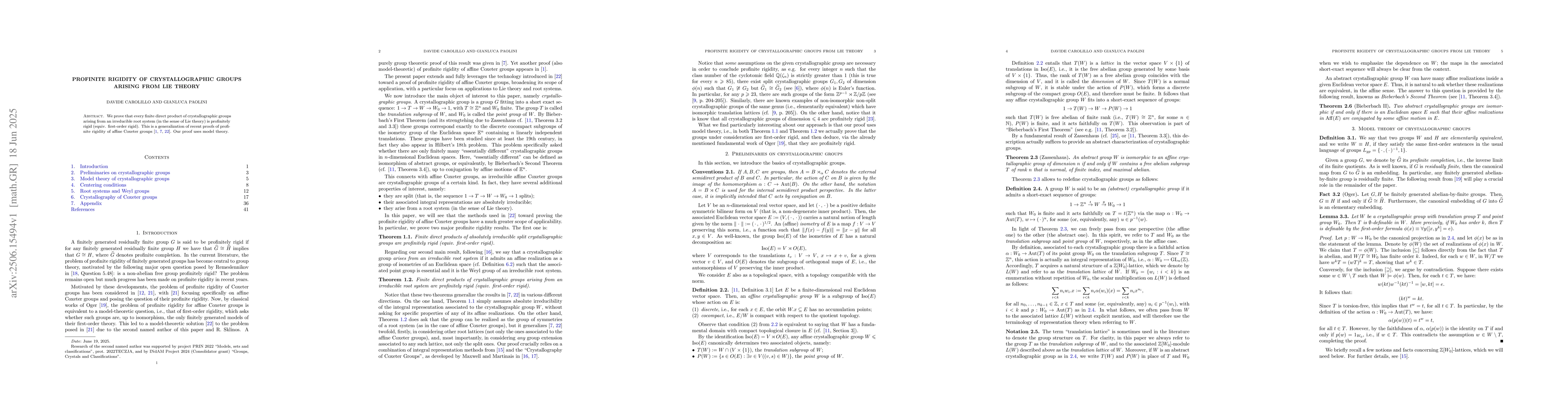 This research proves that any finite combination of crystallographic groups, derived from irreducible root systems in Lie theory, is profinitley rigid. The proof employs model theory, extending previous work on affine Coxeter groups.