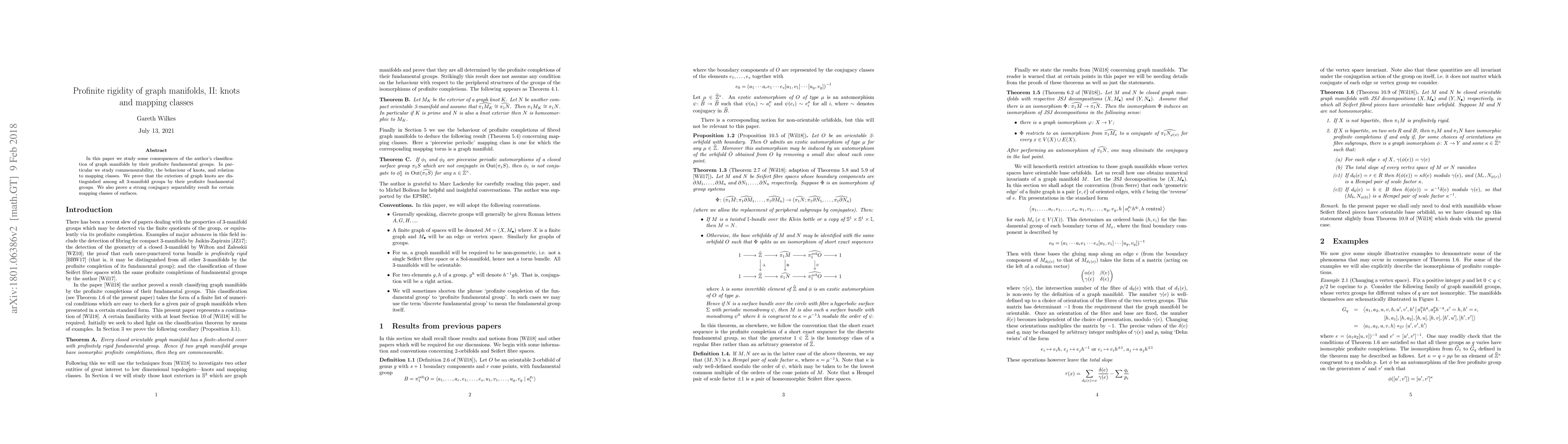 In this paper we study some consequences of the author's classification of graph manifolds by their profinite fundamental groups. In particular we study commensurability, the behaviour of knots, and relation to mapping classes. We prove that the exteriors of graph knots are distinguished among all 3-manifold groups by their profinite fundamental groups. We also prove a strong conjugacy separability result for certain mapping classes of surfaces.