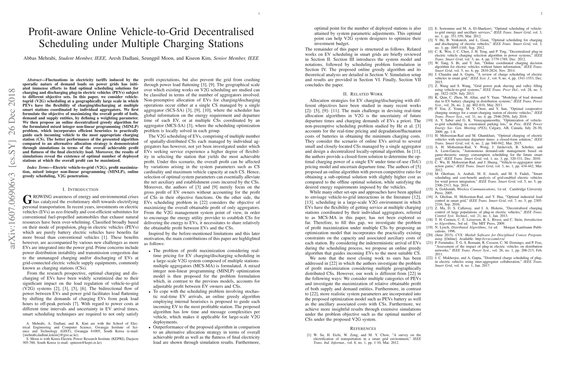 Fluctuations in electricity tariffs induced by the sporadic nature of demand loads on power grids has initiated immense efforts to find optimal scheduling solutions for charging and discharging plug-in electric vehicles (PEVs) subject to different objective sets. In this paper, we consider vehicle-to-grid (V2G) scheduling at a geographically large scale in which PEVs have the flexibility of charging/discharging at multiple smart stations coordinated by individual aggregators. We first formulate the objective of maximizing the overall profit of both, demand and supply entities, by defining a weighting parameter. We then propose an online decentralized greedy algorithm for the formulated mixed integer non-linear programming (MINLP) problem, which incorporates efficient heuristics to practically guide each incoming vehicle to the most appropriate charging station (CS). The better performance of the presented algorithm compared to an alternative allocation strategy is demonstrated through simulations in terms of the overall achievable profit and flatness of the final electricity load. Moreover, the results of simulations reveal the existence of optimal number of deployed stations at which the overall profit can be maximized.