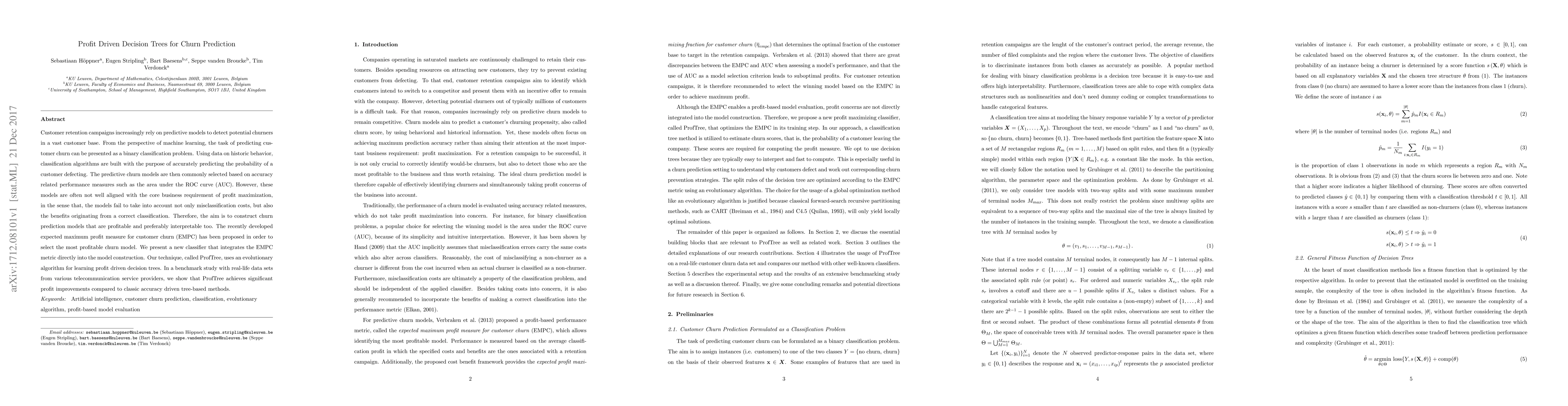 A new approach called ProfTree uses evolutionary algorithms to create profit-driven decision trees for churn prediction, achieving significant improvements in profit compared to traditional accuracy-based methods.
