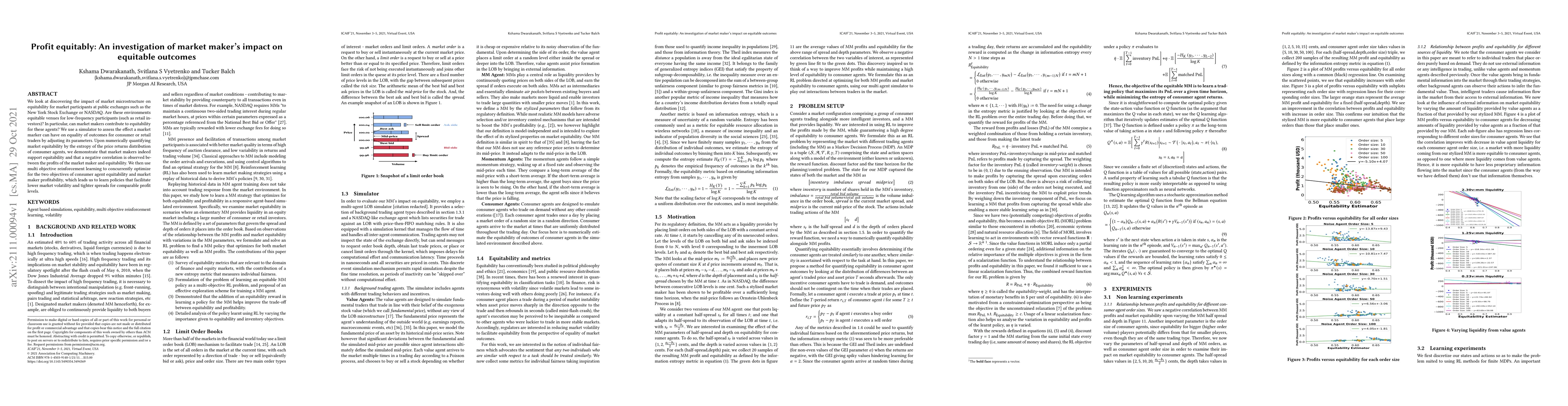 We look at discovering the impact of market microstructure on equitability for market participants at public exchanges such as the New York Stock Exchange or NASDAQ. Are these environments equitable venues for low-frequency participants (such as retail investors)? In particular, can market makers contribute to equitability for these agents? We use a simulator to assess the effect a market marker can have on equality of outcomes for consumer or retail traders by adjusting its parameters. Upon numerically quantifying market equitability by the entropy of the price returns distribution of consumer agents, we demonstrate that market makers indeed support equitability and that a negative correlation is observed between the profits of the market maker and equitability. We then use multi objective reinforcement learning to concurrently optimize for the two objectives of consumer agent equitability and market maker profitability, which leads us to learn policies that facilitate lower market volatility and tighter spreads for comparable profit levels.