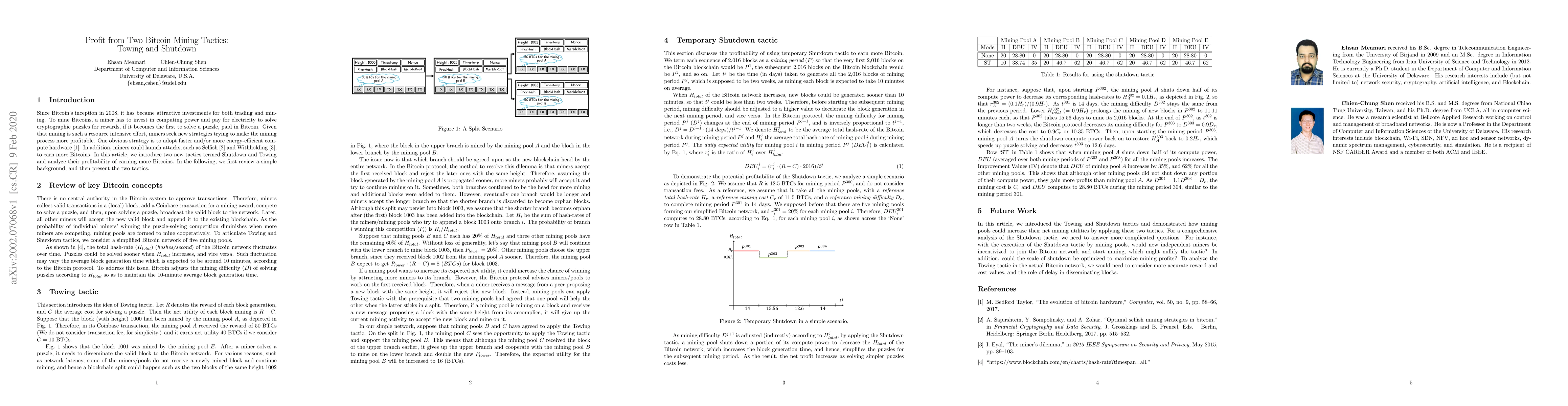 This paper examines two Bitcoin mining strategies—towing and shutdown—aimed at increasing profitability by optimizing resource usage and electricity costs. The study evaluates the potential financial gains from these tactics in the competitive mining environment.