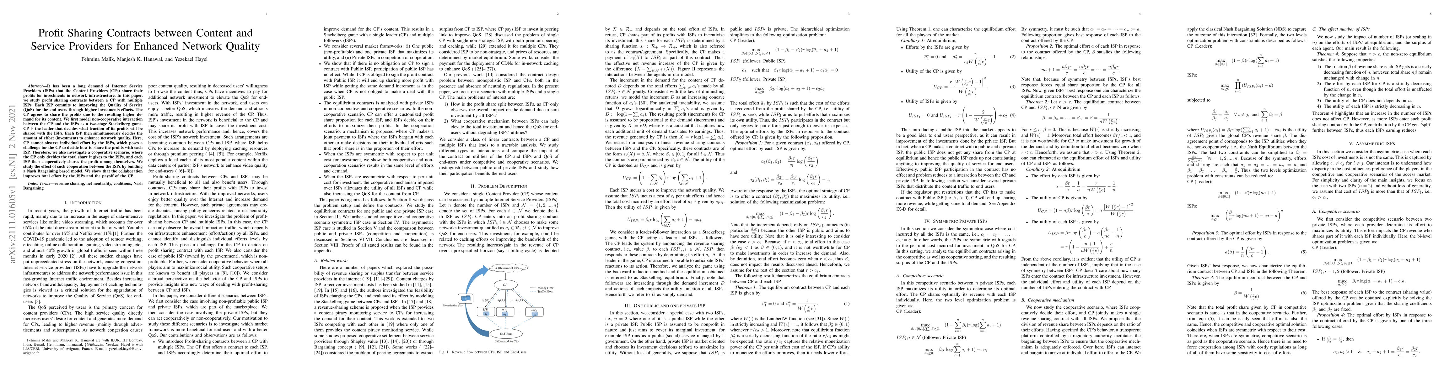This paper examines profit sharing contracts between Content Providers (CPs) and Internet Service Providers (ISPs) to enhance network quality. It models the interaction as a Stackelberg game, where CPs decide profit-sharing fractions, and ISPs invest in QoS improvements. The study also explores a cooperative scenario where ISPs share profits among themselves, showing that collaboration boosts ISP efforts and CP payoffs.