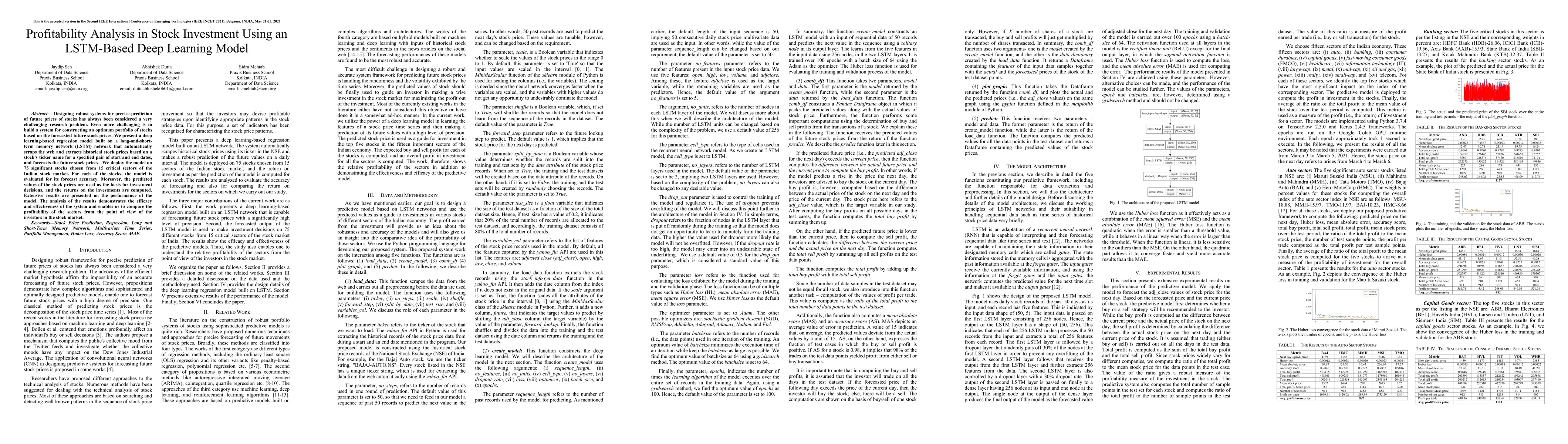 This paper presents a deep learning model using LSTM networks to predict future stock prices and construct optimal portfolios, evaluating its performance on 75 Indian stocks. The model's profitability is analyzed, demonstrating its effectiveness in generating investment returns and comparing sectoral profitability.