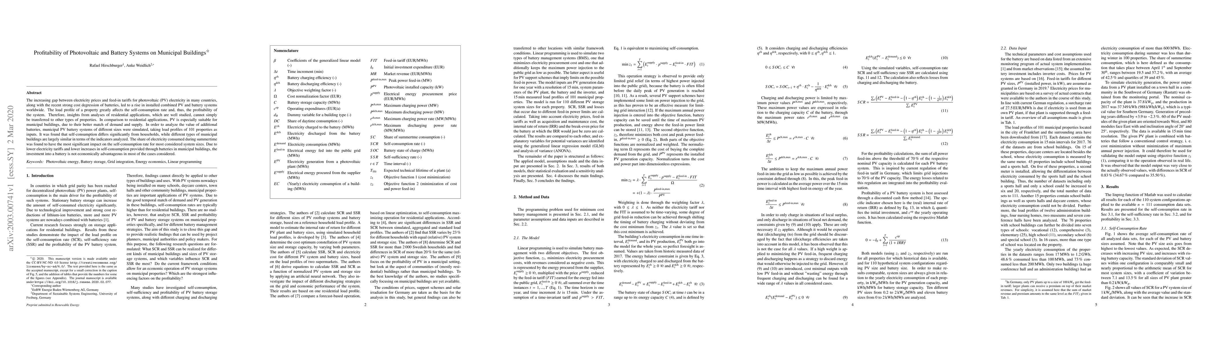 The increasing gap between electricity prices and feed-in tariffs for photovoltaic (PV) electricity in many countries, along with the recent strong cost degression of batteries, led to a rise in installed combined PV and battery systems worldwide. The load profile of a property greatly affects the self-consumption rate and, thus, the profitability of the system. Therefore, insights from analyses of residential applications, which are well studied, cannot simply be transferred to other types of properties. In comparison to residential applications, PV is especially suitable for municipal buildings, due to their better match of demand and supply. In order to analyze the value of additional batteries, municipal PV battery systems of different sizes were simulated, taking load profiles of 101 properties as inputs. It was found that self-consumption differs significantly from households, while different types of municipal buildings are largely similar in terms of the indicators analyzed. The share of electricity consumed during summertime was found to have the most significant impact on the self-consumption rate for most considered system sizes. Due to lower electricity tariffs and lower increases in self-consumption provided through batteries in municipal buildings, the investment into a battery is not economically advantageous in most of the cases considered.
