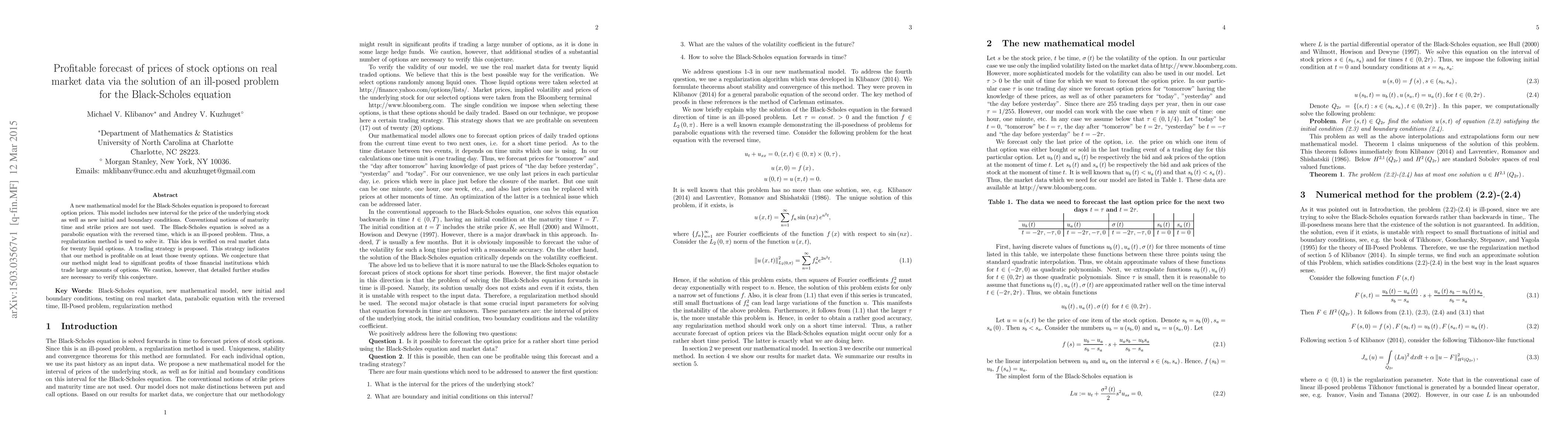 A new mathematical model forecasts option prices using a modified Black-Scholes equation, solving an ill-posed problem with regularization to achieve profitable results on real market data.