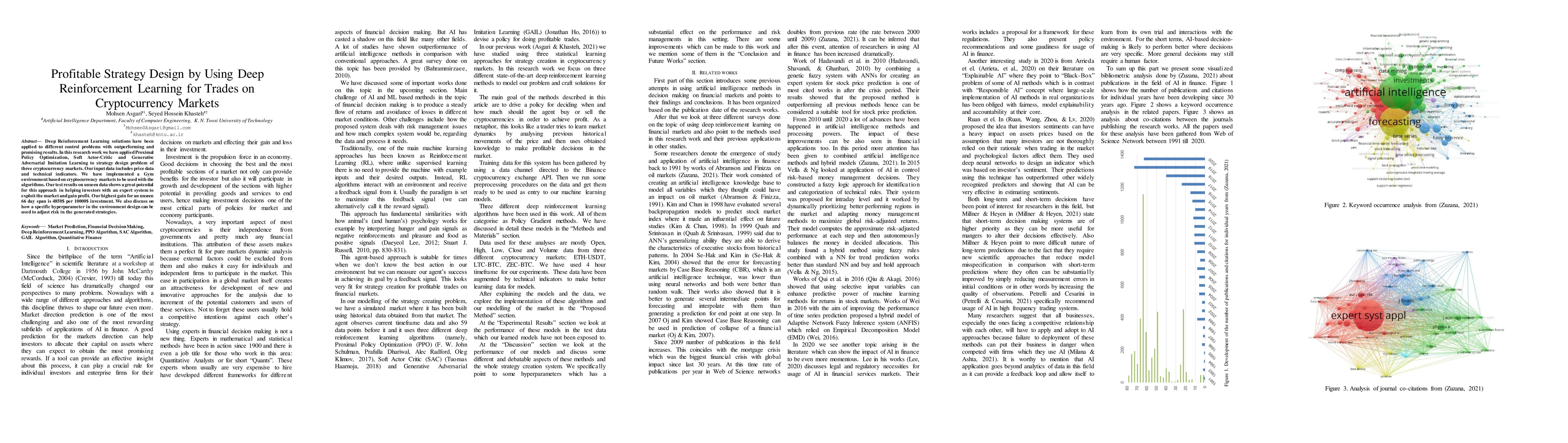 This research applies Deep Reinforcement Learning algorithms (Proximal Policy Optimization, Soft Actor-Critic, Generative Adversarial Imitation Learning) to design profitable cryptocurrency trading strategies. Results indicate high potential for these methods, with up to 4850 USD gained from a 10000 USD investment over 66 days, demonstrating the possibility of an expert system for market exploitation and risk adjustment via environment design hyperparameters.
