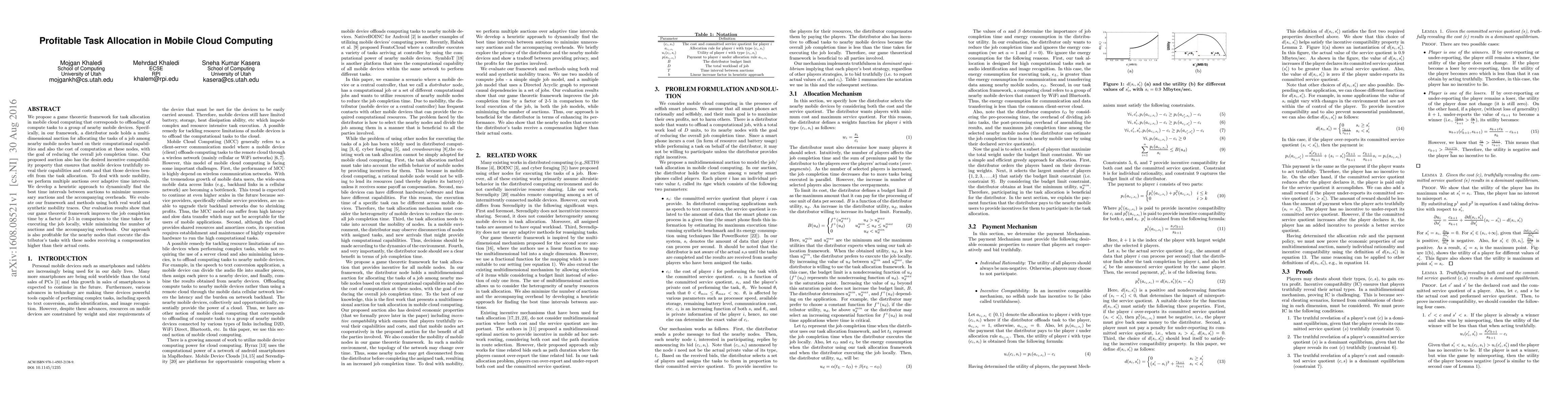 This paper proposes a game-theoretic framework for task allocation in mobile cloud computing that reduces job completion time while minimizing auctions and overheads, leading to a 2-5x improvement over local execution.