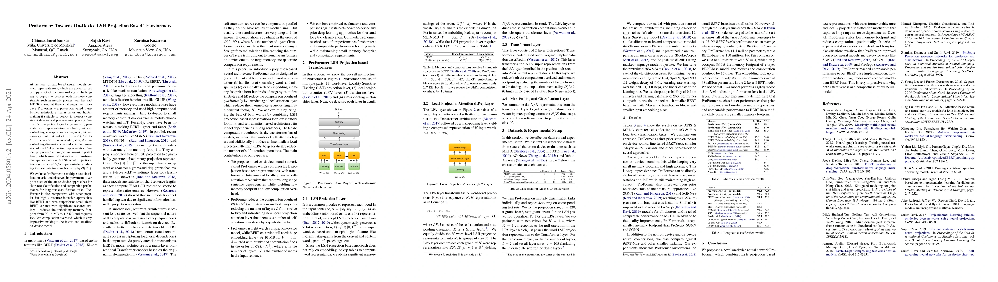 At the heart of text based neural models lay word representations, which are powerful but occupy a lot of memory making it challenging to deploy to devices with memory constraints such as mobile phones, watches and IoT. To surmount these challenges, we introduce ProFormer -- a projection based transformer architecture that is faster and lighter making it suitable to deploy to memory constraint devices and preserve user privacy. We use LSH projection layer to dynamically generate word representations on-the-fly without embedding lookup tables leading to significant memory footprint reduction from O(V.d) to O(T), where V is the vocabulary size, d is the embedding dimension size and T is the dimension of the LSH projection representation. We also propose a local projection attention (LPA) layer, which uses self-attention to transform the input sequence of N LSH word projections into a sequence of N/K representations reducing the computations quadratically by O(K^2). We evaluate ProFormer on multiple text classification tasks and observed improvements over prior state-of-the-art on-device approaches for short text classification and comparable performance for long text classification tasks. In comparison with a 2-layer BERT model, ProFormer reduced the embedding memory footprint from 92.16 MB to 1.3 KB and requires 16 times less computation overhead, which is very impressive making it the fastest and smallest on-device model.