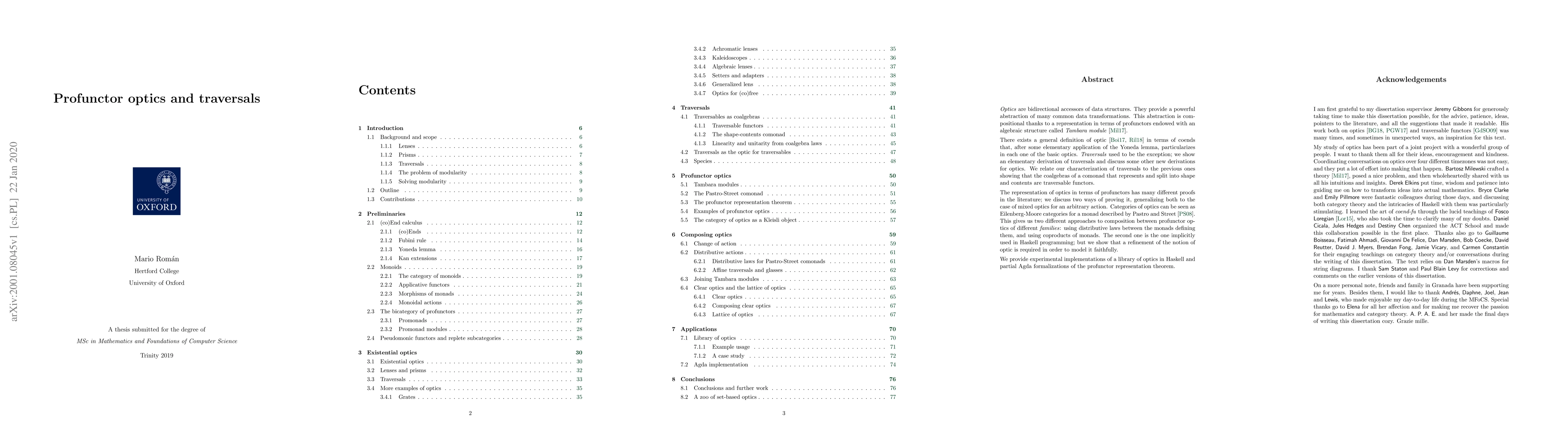 This paper explores the representation of optics using profunctors and Tambara modules, deriving traversals and other optics from a general coend-based definition. It also discusses compositional approaches for combining optics, comparing Haskell's implicit methods with refined theoretical models, and provides Haskell implementations and Agda formalizations.