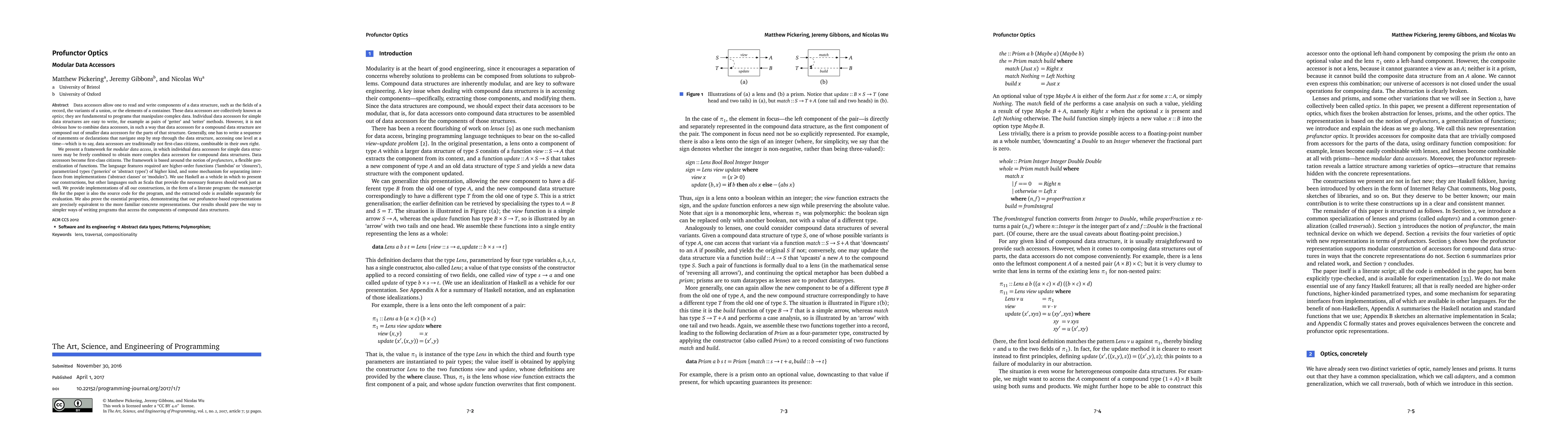 This paper introduces a framework for modular data access using profunctor optics, enabling the combination of simple data accessors into complex ones for compound data structures. The approach leverages higher-order functions and parametrized types, demonstrated through Haskell but applicable to other languages with similar features.