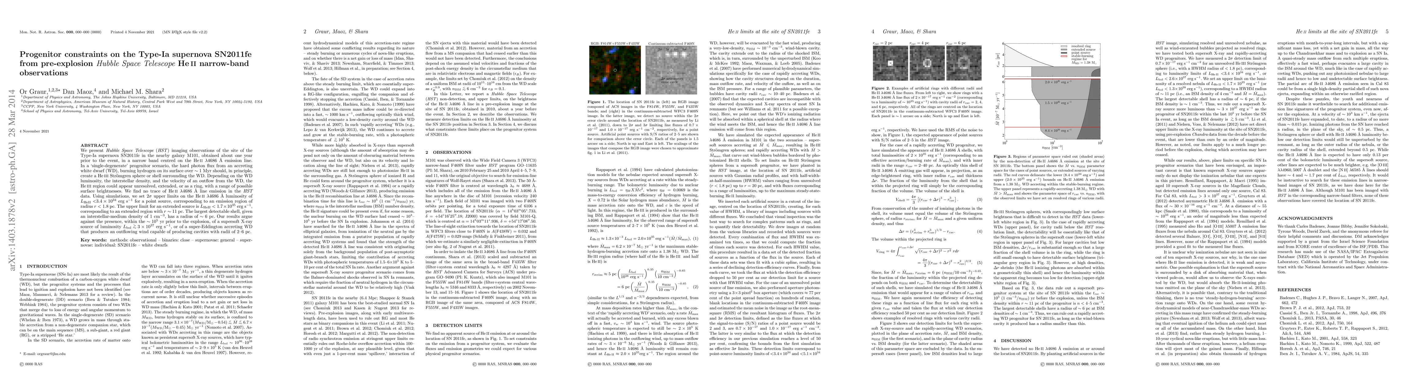 This study used Hubble Space Telescope HeII narrow-band observations of SN2011fe's host galaxy M101, taken a year before the supernova, to investigate its progenitor. No HeII 4686 Å line emission was detected, suggesting no HeIII Strömgren sphere or shell from a single-degenerate progenitor within ~10^5 years prior to the explosion. Upper limits on HeII luminosity were set, constraining possible white dwarf luminosities and ruling out supersoft X-ray sources or super-Eddington accreting WDs producing cavities of 2-6 pc radius.