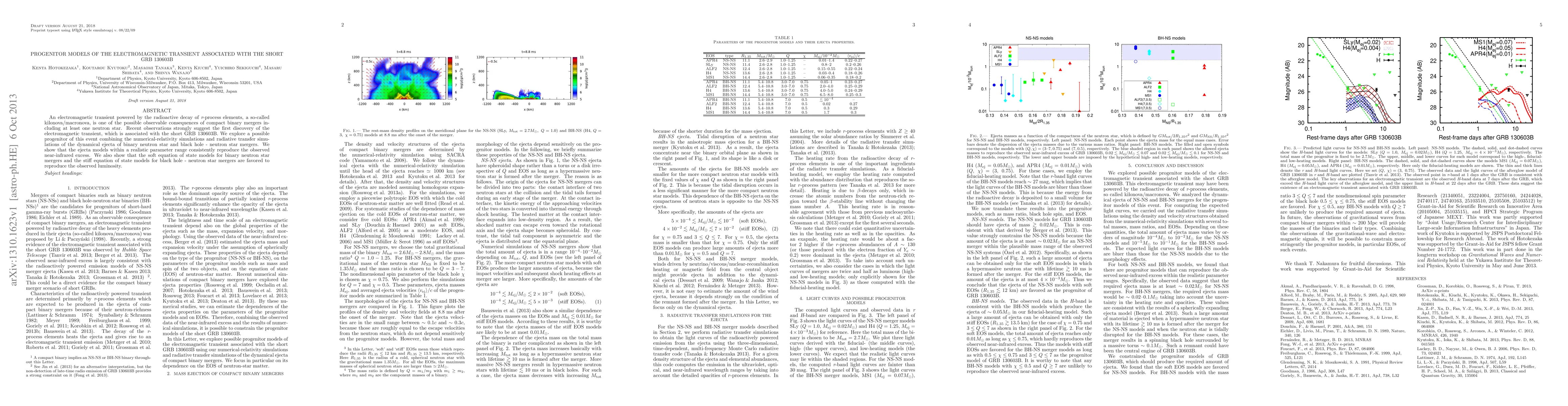 An electromagnetic transient powered by the radioactive decay of r-process elements, a so-called kilonova/macronova, is one of the possible observable consequences of compact binary mergers including at east one neutron star. Recent observations strongly suggest the first discovery of the electromagnetic transient, which is associated with the short GRB 130603B. We explore a possible progenitor of this event combining the numerical-relativity simulations and radiative transfer simulations of the dynamical ejecta of binary neutron star and black hole - neutron star mergers. We show that the ejecta models within a realistic parameter range consistently reproduce the observed near-infrared excess. We also show that the soft equation of state models for binary neutron star mergers and the stiff equation of state models for black hole - neutron star mergers are favored to reproduce the observed luminosity.